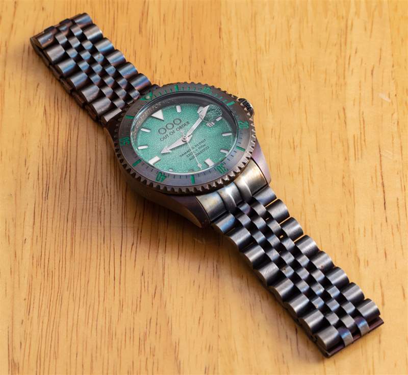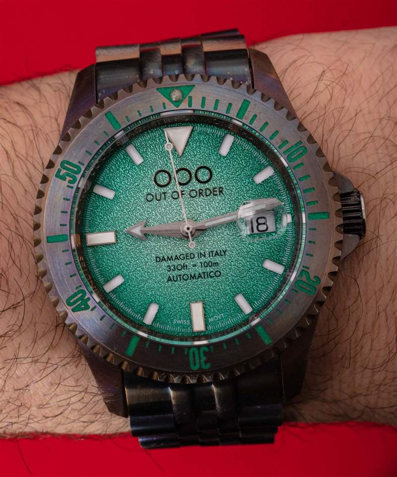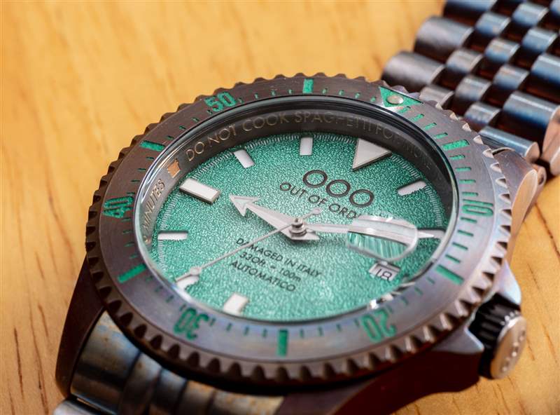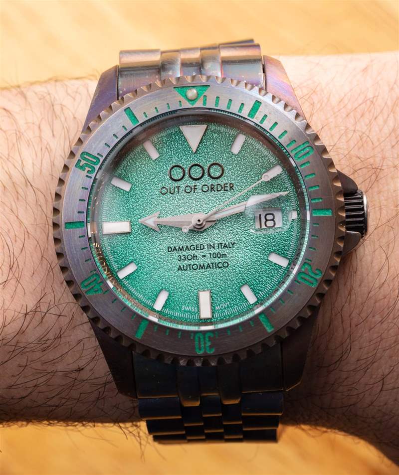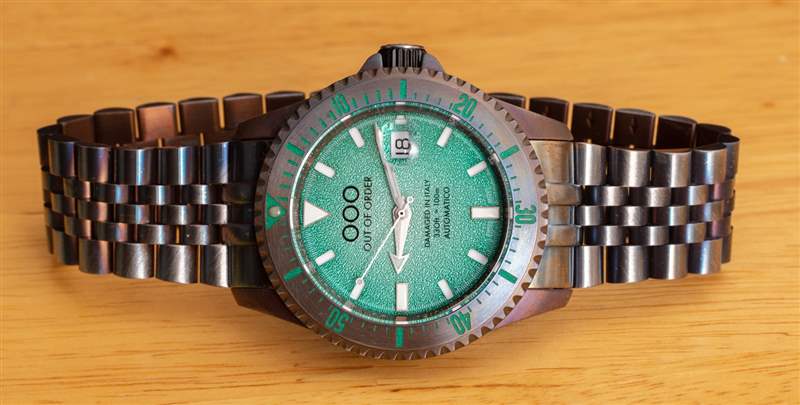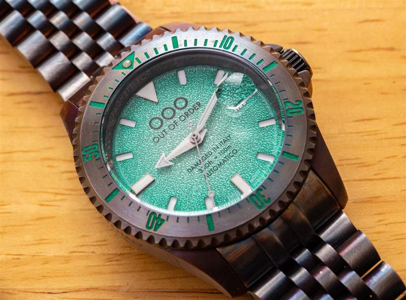 附在表殼上的是一個 Jubilee 風格的手鏈,大小合適。時尚方面,OOO Swiss Automatico 有很多值得喜歡的地方,因為它在精致方面的不足之處在于它彌補了視覺上的活潑和純粹的個性。推出時,Out Of Order Swiss Automatico 系列有黑色、橙色、藍色或這種綠色表盤可供選擇,每種都有其獨特的個性和吸引力。