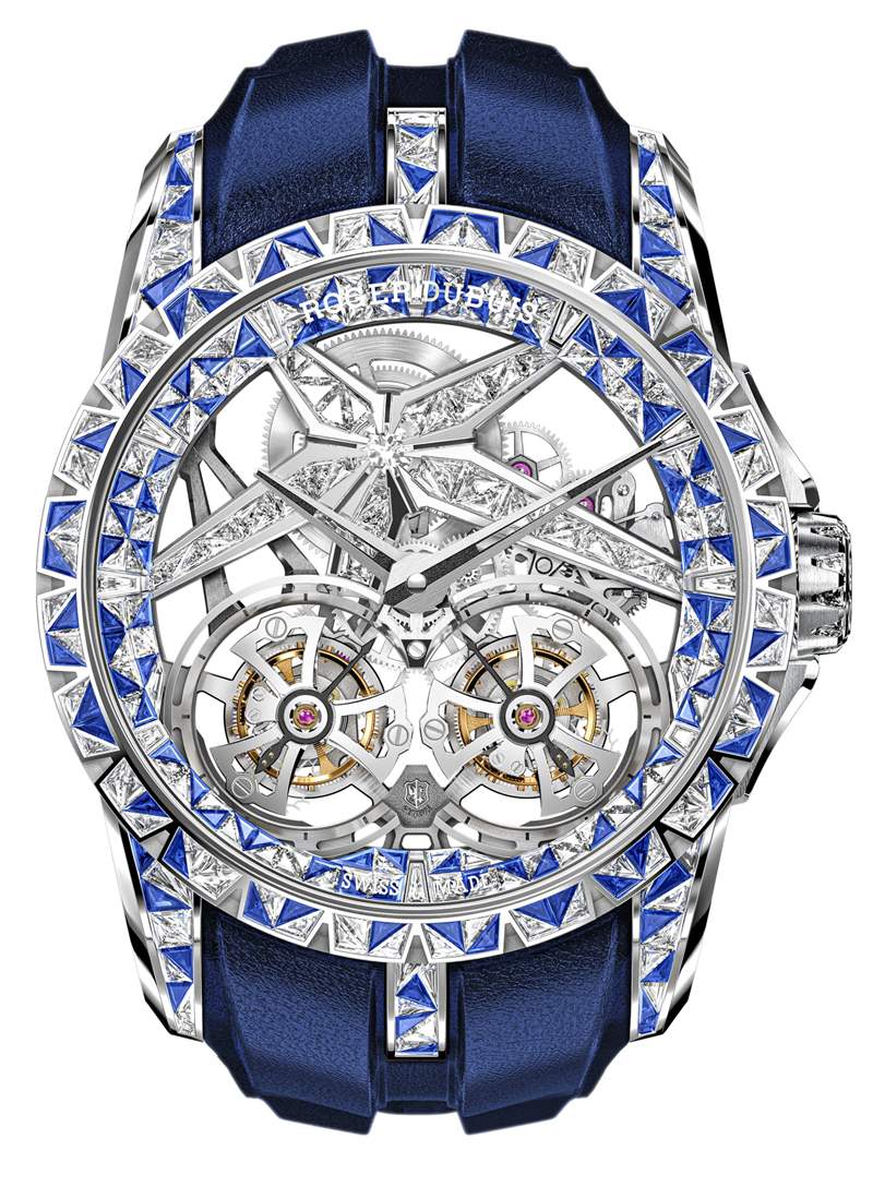 Excaliber Superbia 腕表寬 45 毫米(14.4 毫米厚,??防水深度達 100 米),采用 18k 白金 Excalibur 風格表殼,交替鑲嵌四面體切割鉆石和深藍色藍寶石。腕表內鑲嵌了 600 顆鉆石和藍寶石。Roger Dubuis 公開將手表描述為“相信生活不過是充分利用他人的游戲的一群人的終極圖騰”——換句話說,那些成功地(并且經常令人震驚地)剝削他人的人。是的,當這些人很容易被標記時,它會很有幫助——比如使用獨一無二的藍色和白色閃閃發光的鐘表。羅杰杜彼通過幫助識別感興趣的人來幫助進步的努力。看,在像瑞士這樣以公平為重點的社會中,每個人都會獲勝。