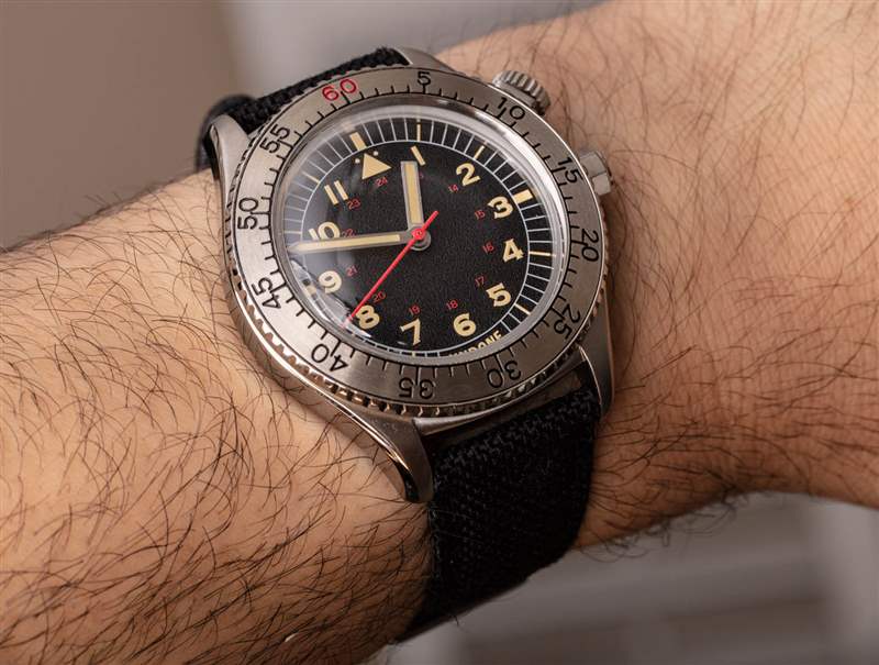 使用 Aero 手表 Undone 完成的最聰明的事情之一就是在指針和表盤之間形成對比。Aero Scientific 采用淺色奶油色表盤和高對比度藍色指針。Aero Commando 采用了不同的方法,這里專注于時針和分針的精加工。表盤本身毫無疑問是“經典飛行員”,但卻是設計元素的時尚新融合,它們被塑造在一起創造出新的東西。奶油色的標記和發光體與略帶紋理的黑色表盤搭配得非常好。Undone 通過使時針和分針本身經過拉絲而不是拋光來進一步做了正確的事情。刷過的手更加突出,而拋光的手往往更難閱讀(而且通常看起來很便宜)。