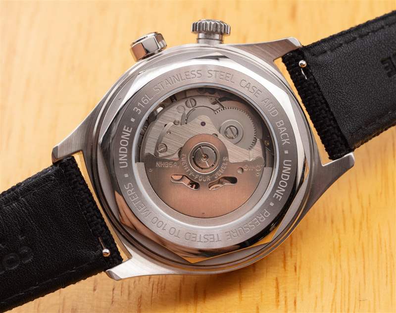 鋼殼外觀的鋼質表圈是我非常喜歡的一種,我認為它適用于 Aero Commando。手表內部是日本精工儀器NH35A自動機芯,通過展示底蓋窗口很好地展示。40 毫米寬的表殼厚度為 15 毫米,這意味著雖然這是一款尺寸適中的手表,但感覺并不小。Undone 在手表的整體耐磨性和時尚性方面繼續受到贊譽。