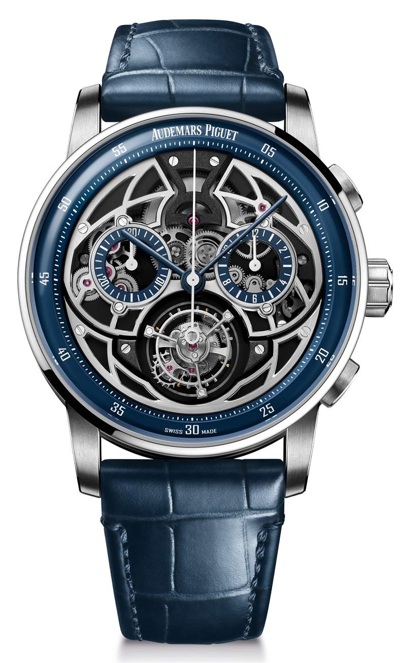 寶藍(lán)色漆用于裝飾表盤的法蘭環(huán)以及計(jì)時(shí)碼表子表盤上的法蘭環(huán)。藍(lán)色仍然是制表界非常流行的顏色,這讓 Code 11.59 自動(dòng)上鏈飛行陀飛輪計(jì)時(shí)碼表的第一版成為時(shí)尚潮流。我預(yù)計(jì)愛彼會將相同的表殼、表盤和機(jī)芯組合呈現(xiàn)在額外的金色或貴金屬表殼中,并使用不同的表盤顏色。可讀性可能是一個(gè)挑戰(zhàn),因?yàn)殚_放式表盤上的藍(lán)色指針在某些照明條件下可能很難發(fā)現(xiàn)(想想看,指針可能會長一點(diǎn)),盡管至少法蘭環(huán)有完整的分鐘和小時(shí)標(biāo)記。