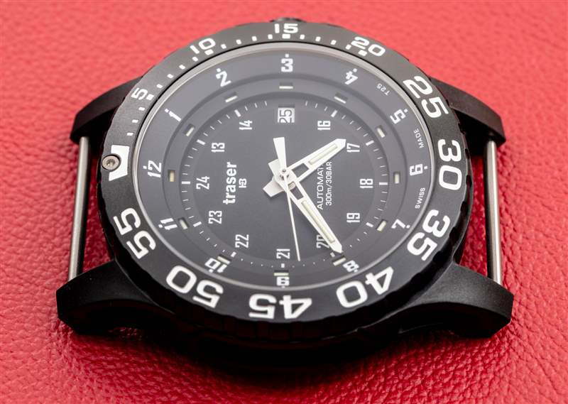 黑色聚合物外殼的側邊部分采用鏤空設計,以展示內部的噴砂精鋼表殼。表盤周圍是一個單向旋轉計時表圈,在 60 分鐘標記處有一個氚氣管流明點。總的來說,擋板有一個不錯的動作。說到 lume,盡管 Traser 歸制造氣管的公司所有,但這款特殊的手表并不像現在其他一些配備氚氣管的手表那樣充滿氣管和照明。Traser 不追求最大亮度,而是追求最大實用性和實用性。在黑暗中的可讀性很好,但手表并沒有試圖用它的氣管給任何人留下深刻印象,就像你在 Ball 手表中看到的那樣。