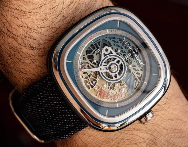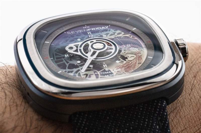 與其他一些 SevenFriday 型號(hào)相比,SevenFriday T1 系列作為手表非常簡(jiǎn)單。表盤只有時(shí)間,帶有傳統(tǒng)的時(shí)針和分針。手表內(nèi)部的機(jī)芯是日本精工NH70,工作頻率為3Hz,動(dòng)力儲(chǔ)存40小時(shí)。然而,表盤的設(shè)計(jì)卻是俏皮的,將藝術(shù)元素與機(jī)芯外觀和許多傳統(tǒng)表盤特征混合在一起,例如非常清晰的銀色分鐘刻度環(huán)和更靠近中心的新穎的時(shí)標(biāo)環(huán)表盤。