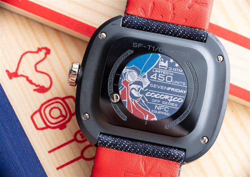 在手表的背面,你有漂亮的額外的 Cocorico 藝術(shù)品,雞的角色更加清晰可辨。您還可以看到,這款手表是 SevenFriday 更前衛(wèi)的“Off 系列”(SevenFriday 設(shè)計(jì)師進(jìn)行了更多實(shí)驗(yàn))的一部分,并且 T1 手表系列還具有內(nèi)置的 NFC(近場(chǎng)通信)芯片。該芯片用作手表的個(gè)性化標(biāo)識(shí)符,并且比雕刻/蝕刻序列號(hào)更安全。如果您想使用此功能,那么您可以使用支持 NFC 掃描的手機(jī)和專門的網(wǎng)站來(lái)讀取芯片并將您的手表注冊(cè)為所有者。