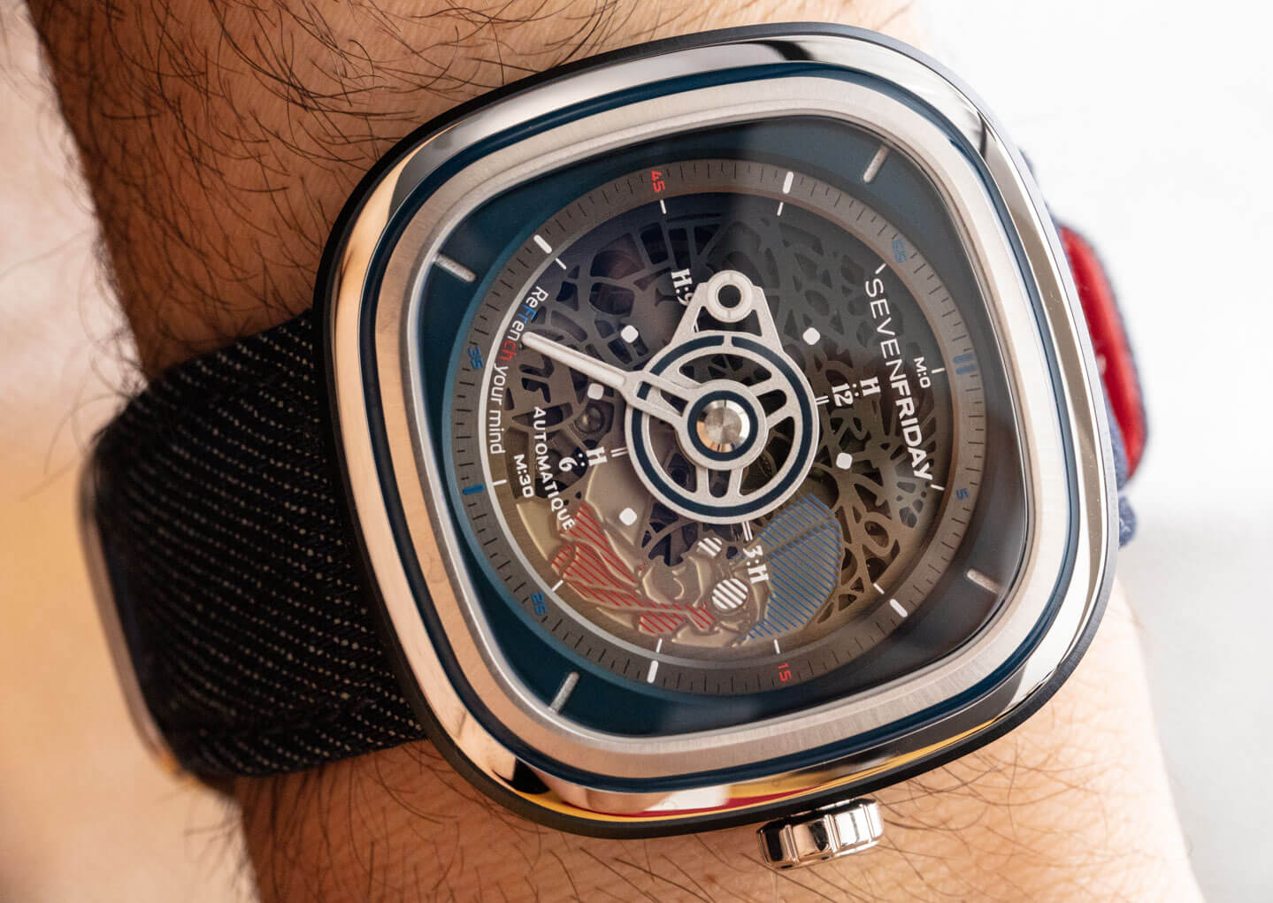 我們?cè)?SevenFriday 產(chǎn)品中繼續(xù)看到的小細(xì)節(jié)使它們變得最有趣。以表帶后部的雞腳印為例。表帶本身采用紅色皮革和藍(lán)色牛仔布制成,并以特殊形狀制成,旨在與表殼相得益彰。當(dāng)手表產(chǎn)品每個(gè)系列都有這么多定制零件時(shí),很難抱怨價(jià)格。
