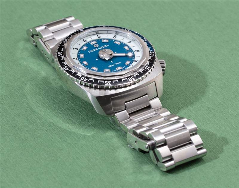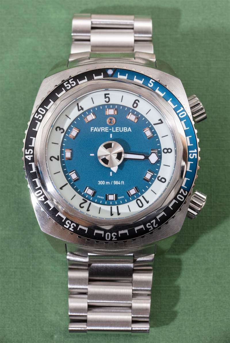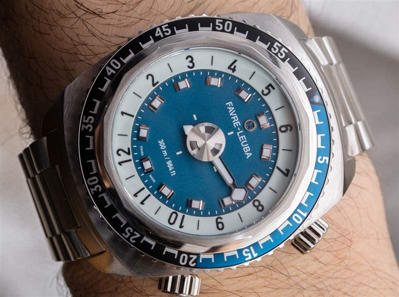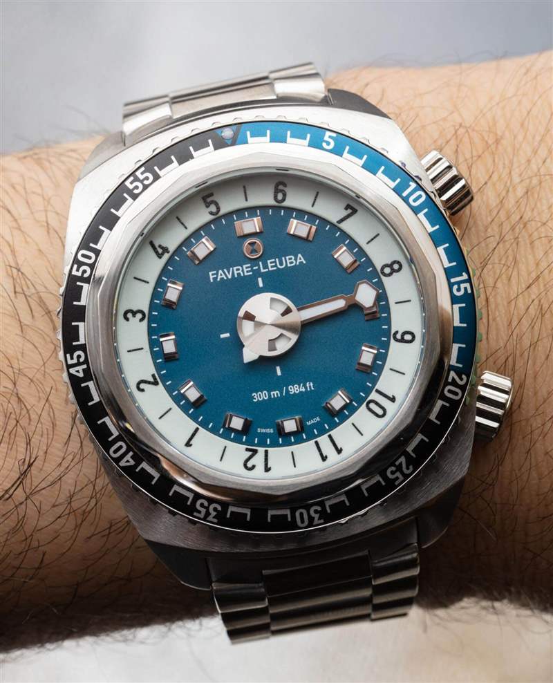 要了解手表的整體設計,檢查 1970 年代左右的老式 Favre-Leuba 手表的外觀很有用。今天的 Favre-Leuba 品牌將許多老式運動手表品牌的有趣怪癖引入了今天的現代手表。這種風格并不適合所有人,但我碰巧很喜歡它,老實說,它會隨著你的成長而成長。從表殼的整體形狀到表圈的設計,當然還有有趣的表盤,這里有很多值得喜歡的地方。單向旋轉潛水員風格計時表圈是整體設計中更具 1970 年代風格的元素之一,并印在鋁制表圈插件上。當然,我更喜歡陶瓷,但表圈插件實際上很窄,確實有助于給手表帶來更受歡迎的復古氛圍。