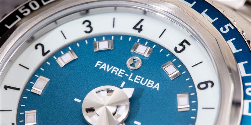1970 年代運動手表的典型代表是使用鮮艷的色彩和粗大的塊狀元素,例如指針和時標。這在這里太真實了,有助于給 Raider Harpoon 一個非常適合時代的氛圍。Favre-Leuba 用 Super-LumiNova 為分針和秒針涂漆,整個小時環本身由發光材料制成。這使得在黑暗中讀取時間變得非常容易,假設發光體之前已經充滿了光。