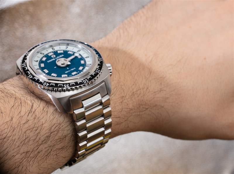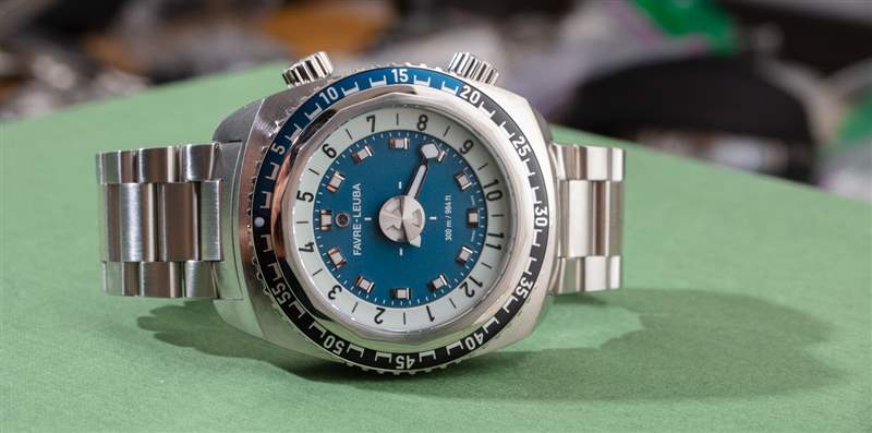 在我的手腕上是 Favre-Leuba Raider Harpoon 42 參考 00.10131.08.52.20,帶有藍色主題的表盤和配套的鋼表鏈。這款手表與 Original Raider Harpoon 46 手表之間僅有的兩個區別是縮小了尺寸的表殼和稍微降低了防水性。老實說,后一個事實對所有實際用途幾乎沒有影響,因為最初的 Raider Harpoon 46 防水深度達 500 米,而 Raider Harpoon 42 防水深度達 300 米——仍然完全適合使其成為真正的潛水員手表。廣告訊息廣告信息結束