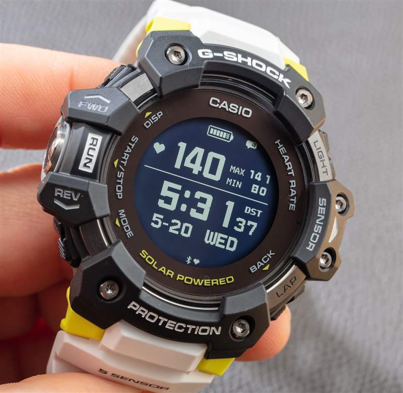 G-Shock Move 也是該品牌首款配備專用心率監測器的“五傳感器”手表。該產品實際上有超過五個傳感器,但按照傳統的計算方式,這五個傳感器是指南針、高度計/氣壓計、溫度計、計步器和心率監測器。不要忘記 GBD-H1000 內部的卡西歐模塊具有 GPS 信號和藍牙連接功能。