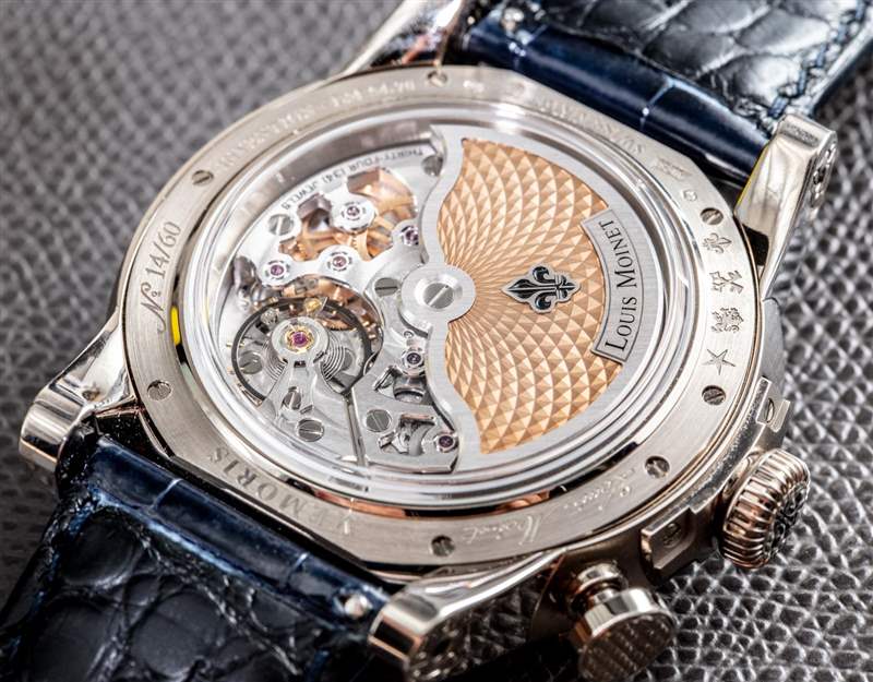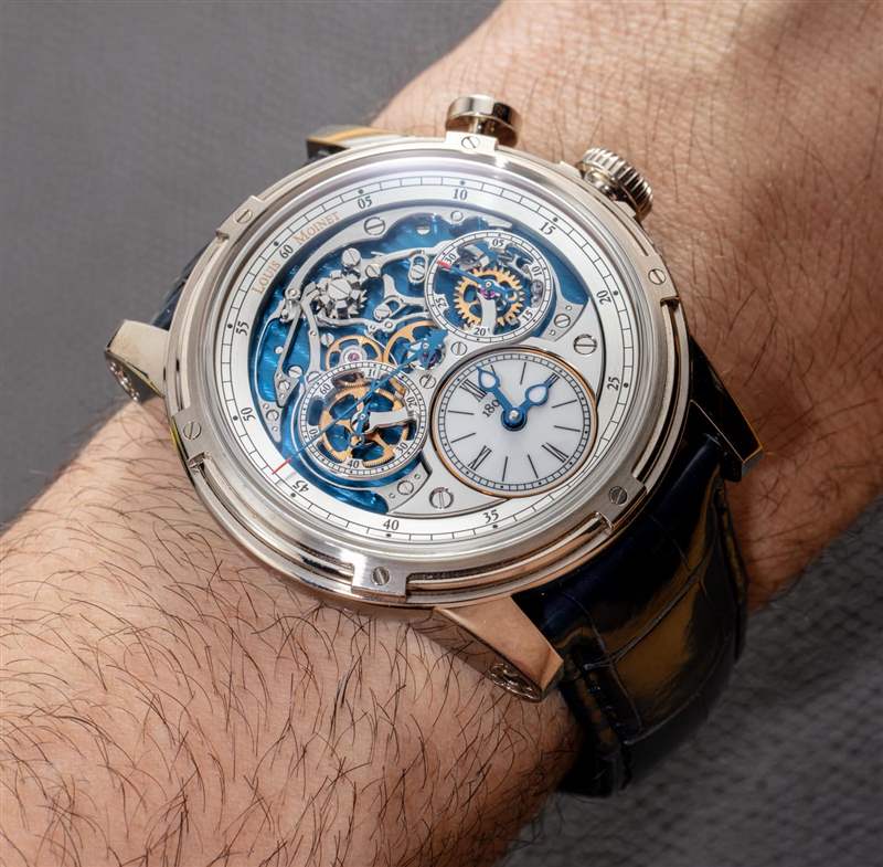 我實際上在 Louis Moinet 網站上找不到 Memoris 手表尺寸。也許他們發現人們在閱讀時會感到“尺寸震驚”。老實說,那塊表并沒有那么大。表殼寬約 46 毫米,厚約 18 毫米,表耳到表耳的距離約為 53 毫米。表盤上有一個圓頂 AR 涂層藍寶石水晶鏡面,機芯上方有其他扁平藍寶石水晶鏡面,作為表殼后部的窗口。附在手表上的是一條高品質的藍色鱷魚皮表帶。佩戴舒適度不錯,但這是一塊更大的手表。我喜歡 Louis Moinet Fleur-de-lys 風格的標志搭扣,但我認為這款手表戴在傳統的針式搭扣上會更舒適一些。