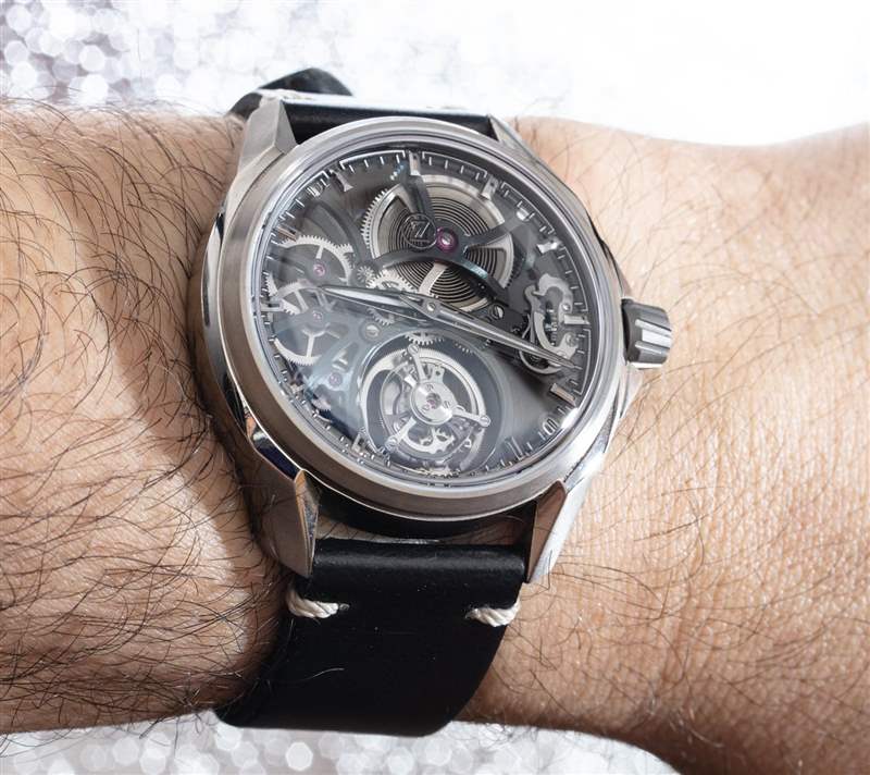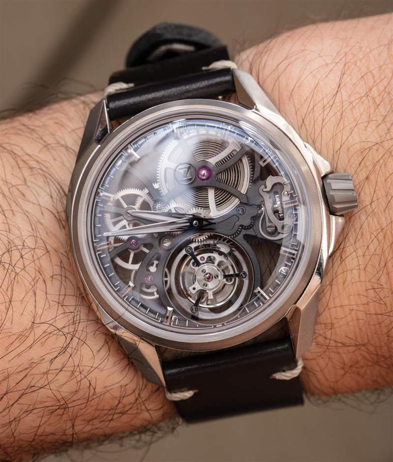 在尺寸方面,Mirage Tourbillon 表殼寬 41 毫米,凸耳-t0-凸耳距離為 45 毫米。與表殼的寬度相比,由于表盤的狹窄,它的磨損也很小。表殼也只有 9.5 毫米厚(沒有頂部的“盒子式”藍寶石水晶),防水等級為 50 米。Zelos 包括一個非常精致的展示套裝,其中包括一個超大號木盒和一個皮革手提箱,可讓您攜帶一套手表,還包括一些額外的表帶選項以混合外觀。