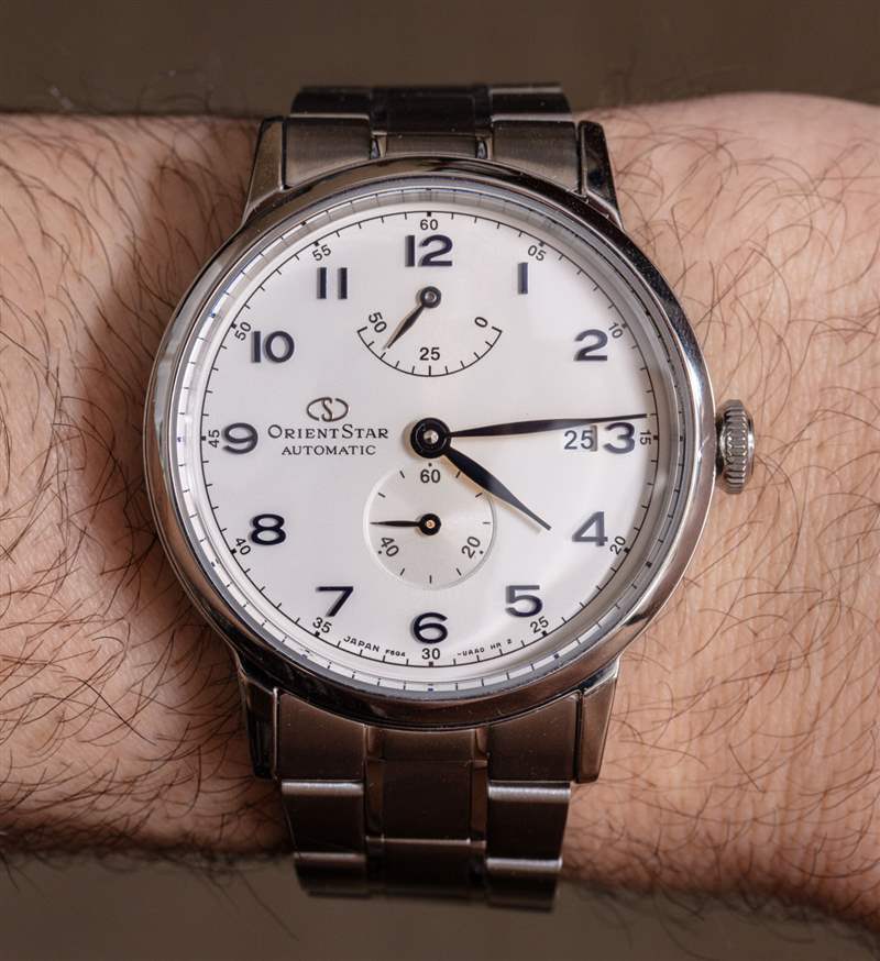在手腕上,Orient Star Classic Mechanical 采用全拋光鋼制成,寬 38.7 毫米,厚 12.4 毫米(表耳到表耳的距離僅為 46 毫米)。這使得尺寸有點偏小,但作為正裝手表或大多數手腕的袖子非常舒適。該表殼還可以防水 50 米。表盤上方是一個略微圓頂的 AR 涂層藍寶石水晶鏡面。