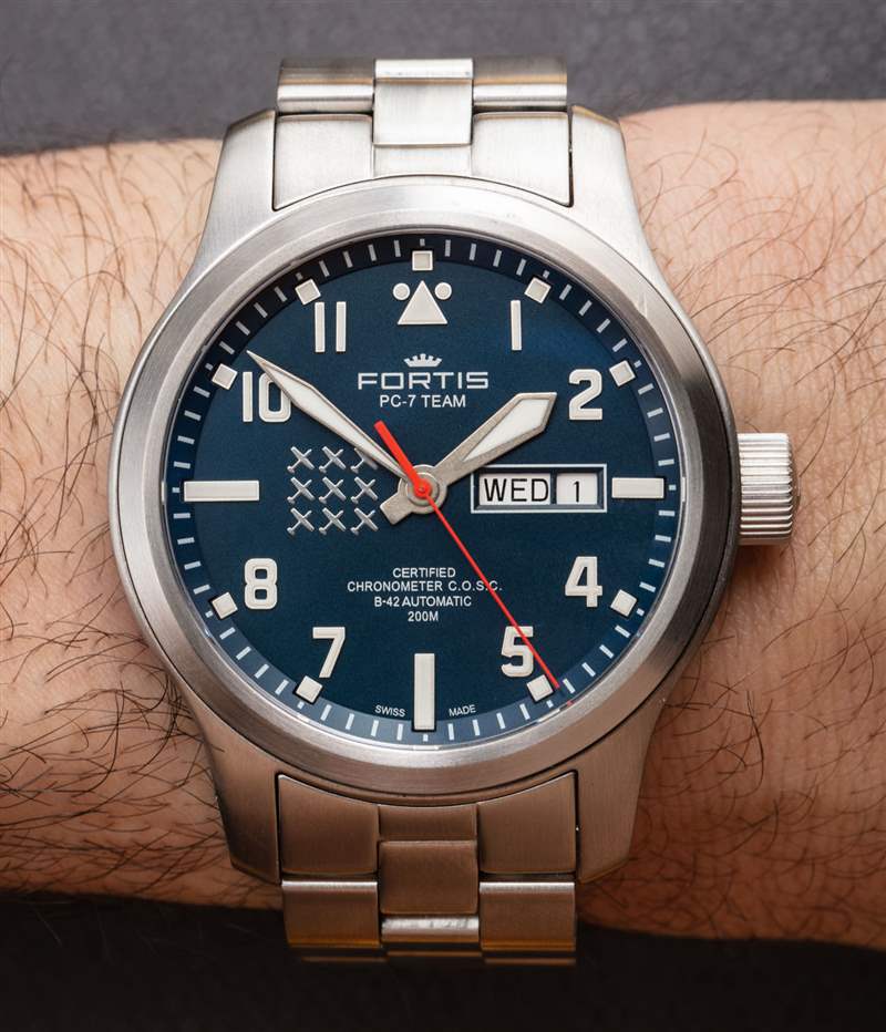 PC-7 團(tuán)隊(duì)版套裝中的兩款手表是 Fortis Aeromaster PC-7 Team Edition Day-Date 型號(hào) 655.10.55 和 Fortis Aeromaster PC-7 團(tuán)隊(duì)版計(jì)時(shí)碼表型號(hào) 656.10.55。每個(gè)都有一個(gè) 42 毫米寬的粗壯表殼,完全由拉絲鋼制成。富通自己的網(wǎng)站實(shí)際上有一個(gè)免責(zé)聲明,“案例大小似乎太大了?似乎只是這樣。” 我不完全確定為什么會(huì)出現(xiàn)在他們的網(wǎng)站上,但這對(duì)我來說有點(diǎn)有趣。鑒于其近 53 毫米的表耳到表耳距離和近 17 毫米的厚度(盡管有扁平的藍(lán)寶石水晶),這肯定是較大的 42 毫米寬手表之一。這些箱子也很漂亮,很重,防水深度為 200 米。這對(duì)于喜歡手腕上的物質(zhì)的人來說是理想的,但對(duì)于那些尋求更加謹(jǐn)慎的現(xiàn)代飛行員風(fēng)格時(shí)計(jì)的人來說可能有點(diǎn)大。在表冠對(duì)面的一側(cè)是一塊小牌匾,上面刻有時(shí)計(jì)獨(dú)特的限量版編號(hào)。