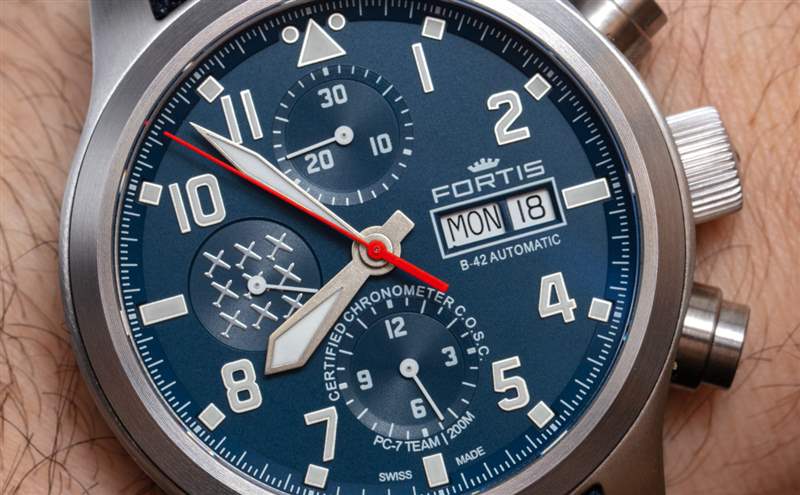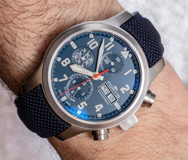 任何尋求具有良好歷史基礎(chǔ)和大膽但不過度尺寸比例的略帶現(xiàn)代飛行員風(fēng)格計(jì)時(shí)碼表的人都應(yīng)該考慮 Aeromaster 時(shí)計(jì)系列。Aeromaster 系列中目前最昂貴的型號(hào)不是這些限量版 PC-7 Team 型號(hào),而是 Aeromaster Alarm Chronograph,它為基礎(chǔ) Valjoux 7750 增加了機(jī)械報(bào)警功能,由 Paul Gerber 為 Fortis 完成。限量版每件 300 件,零售價(jià)高于非限量版 Aeromaster 型號(hào)。Fortis 確實(shí)提供了表帶/手鏈組合,但如果這些藍(lán)色表盤 PC-7 Team 型號(hào)的價(jià)格和款式不完全適合您的口味,則值得關(guān)注更大的 Aeromaster 系列。盡管如此,任何手表愛好者都可以同意,富通目前的 Aeromaster 系列不僅僅是體面的東西。