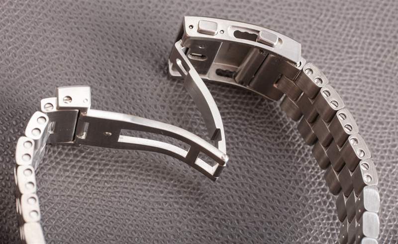 兩款限量版 PC-7 Team Aeromaster 腕表均配有金屬表鏈和定制表帶。雖然我主要是手鐲愛好者,但我實(shí)際上更喜歡這款手表的表帶。那不是因?yàn)槭骤C有什么問題,而是更多關(guān)于它如何適合表殼。手鐲有點(diǎn)突出,使得手表在較小的手腕上佩戴起來不那么優(yōu)雅,比如我自己的手腕。不同款式的表帶更適合較小的手腕。除了外觀有點(diǎn)普通外,手鐲制作精良。鏈節(jié)使用更大尺寸的螺釘連接,展開式表扣還包括一個(gè)微調(diào)系統(tǒng)。我真的認(rèn)為 Fortis 整體上對(duì) Aeromaster 系列有所了解,但它可能會(huì)受益于添加一些尺寸略小且整體比例更薄的型號(hào)。