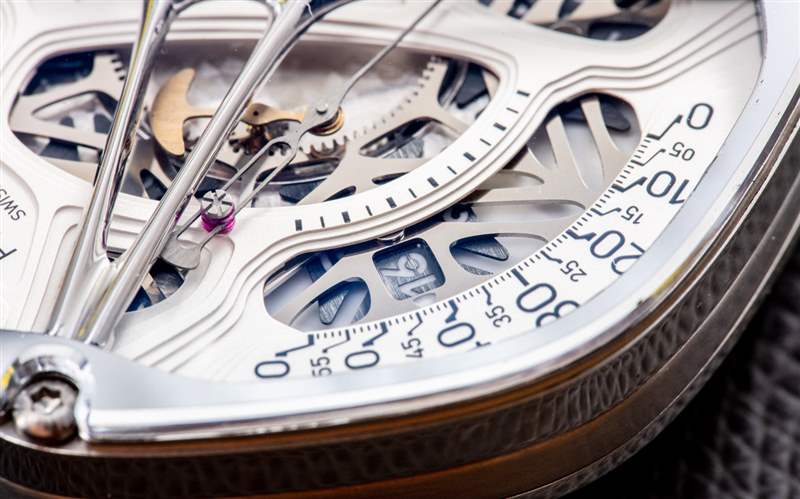 現(xiàn)在,讓我們檢查一下時間顯示。這里有兩個區(qū)域,因為秒的顯示與小時和分鐘的顯示截然不同。秒針位于表殼大約 4 點鐘的象限處,采用了迪特里希 (Dietrich) 稱為相對秒數(shù)的原理。它使用一個奇特的齒輪系統(tǒng)讓秒針跟隨非圓形軌道。我見過(想到的)唯一使用此原理的其他手表是NORD Zeitmaschine.?實際的秒針真的很長,一直延伸到手表另一端的連接點。我只是認為迪特里希認為這種傳動原理很酷,并想找到一種方法將其整合到手表表盤中。有利的一面是,我們現(xiàn)在可以將 60 秒的跨度視為繪制香蕉(或笑臉)。