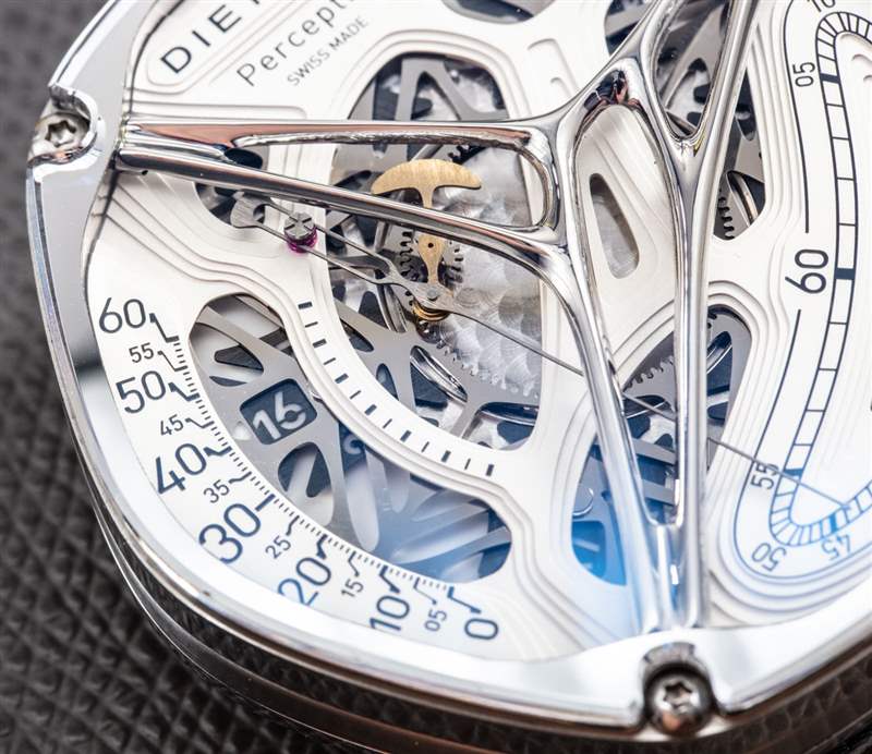 使用基礎(chǔ)瑞士制造的自動機械機芯,Perception 的時間顯示被創(chuàng)建為一個定制模塊,構(gòu)成了表盤的大部分。在裝飾的模塊機芯板上方是一個半鏤空表盤,頂部有一個三尖拋光金屬橋,位于一個大型定制六角形藍寶石水晶下方,位于整個手表頂部。這一概念在Dietrich DD-1這樣的手表中得到了進一步改進,并且價格更實惠。請注意,為了使手表看起來盡可能耐磨,表冠等元素已從標(biāo)準(zhǔn)的 3 點鐘位置移開。