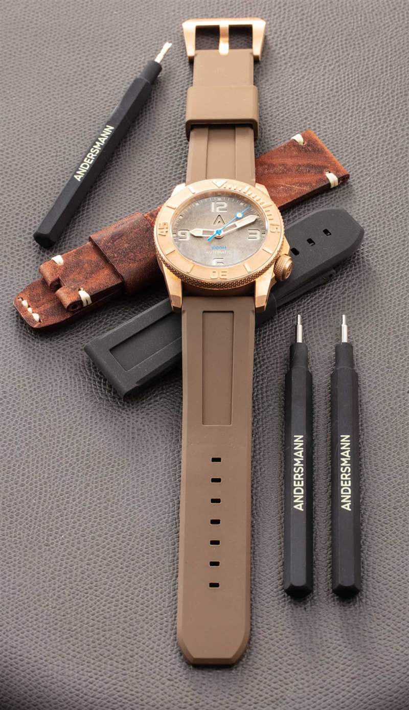 Andersmann Bronze 手表的套件中包含三種表帶選擇以及工具——這是一種受歡迎的感覺。幾年前,安德斯曼的手表有橡膠表帶,我發(fā)現(xiàn)它不會(huì)老化。從那以后,該品牌了解到,較新的橡膠表帶更加發(fā)燒級(jí)(盡管仍然是基本的)。安德斯曼包括一條與表盤相配的卡其色橡膠表帶,以及一條更標(biāo)準(zhǔn)的黑色橡膠表帶。套件中還包括一條做舊的皮革表帶——但對(duì)于運(yùn)動(dòng)或潛水任務(wù),橡膠表帶是最好的選擇。
