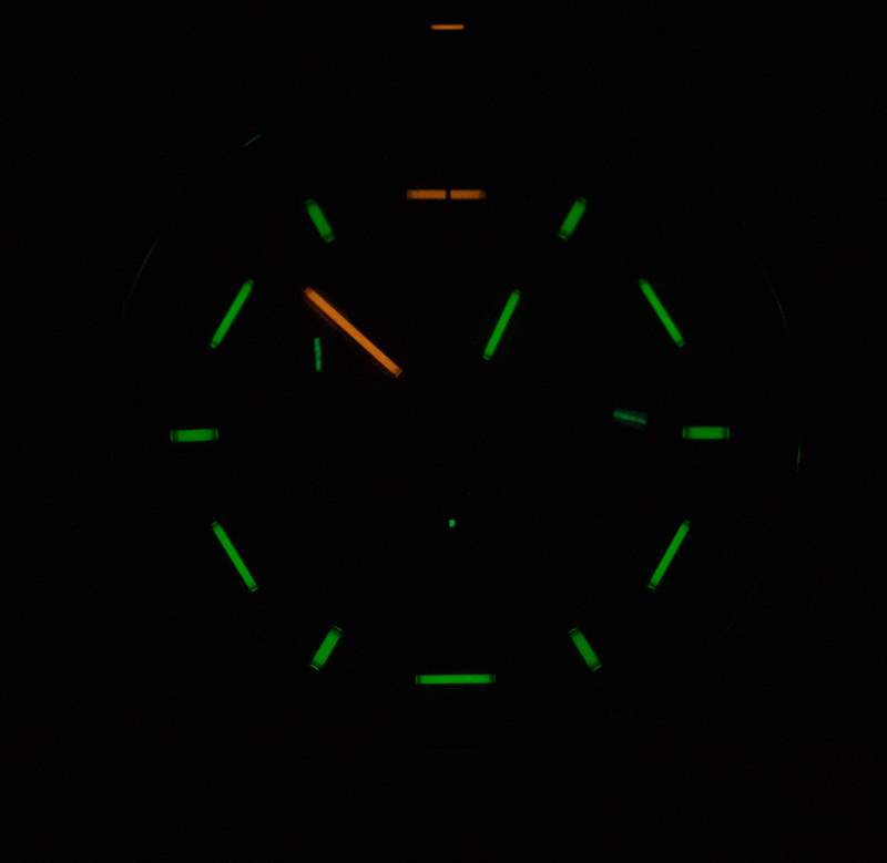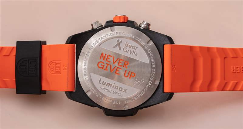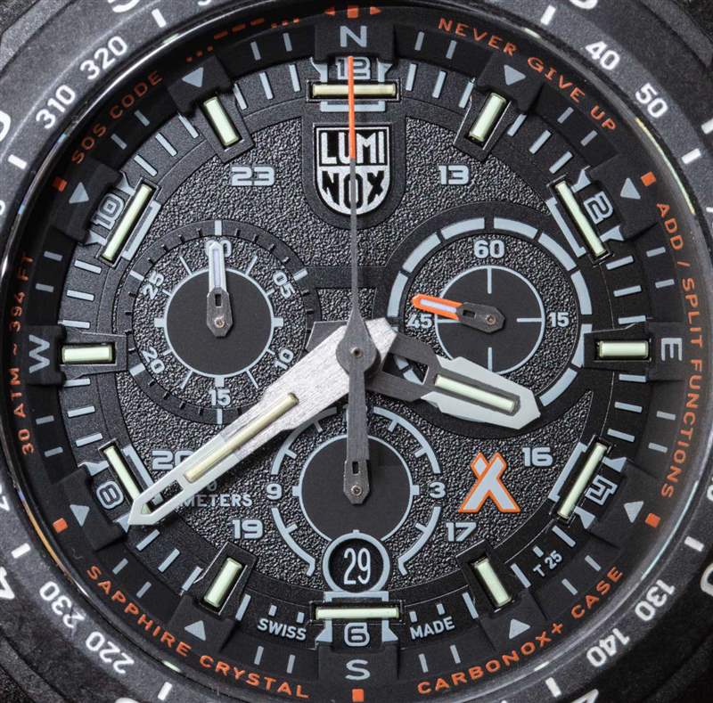 表盤周圍是一個單向旋轉表圈(也是 Carbonox 表圈),在 12 點鐘位置有一個受保護的氚氣管流明管。與大多數 Luminox 手表一樣,Bear Grylls Survival 系列在指針和時標上使用自發光氚氣管,輕松實現黑暗照明。Luminox 和其他少數使用它們的高端手表品牌(Marathon、Traser、Ball)確實提供了比大多數需要光充電的傳統彩繪發光體的手表更好的表盤觀看體驗。