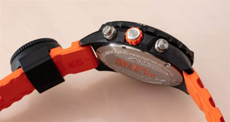 手表本身是一個厚實的 45 毫米寬和 14 毫米厚。它有 24 毫米寬的肩帶,也位于較厚的一側。這只手表的幾乎每個部分都故意感覺大而陽剛。然而,由于是由 Luminox 稱為 Carbonox 的一種鍛造碳材料制成,因此該表殼非常輕,僅重 98 克。帶紋理的黑色表殼防水深度達 300 米,并覆有 AR 涂層藍寶石水晶鏡面。