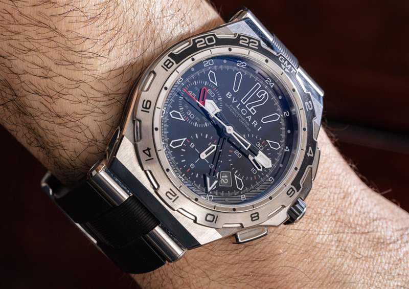 黑色藍寶石表盤配有應用的模板式時標,與大膽的指針完美搭配。表盤上有時間、12 小時計時碼表、GMT 指針和日期窗口。寶格麗設法以一種不會讓人感覺過于混亂的方式將所有這些包括在內,這也有助于表盤所有元素的可讀性非常好。從風格和實用性的角度來看,寶格麗真的做到了。如果你還記得,我提到過 Diagono X-Pro 的一個限量版。這是在標準 X-Pro 發布后不久推出的,是為當時流行的 PuristsPro 會員論壇網站上的手表收藏家社區創建的。如果我沒記錯的話,這只表的唯一區別是表盤標記,而不是印成白色,