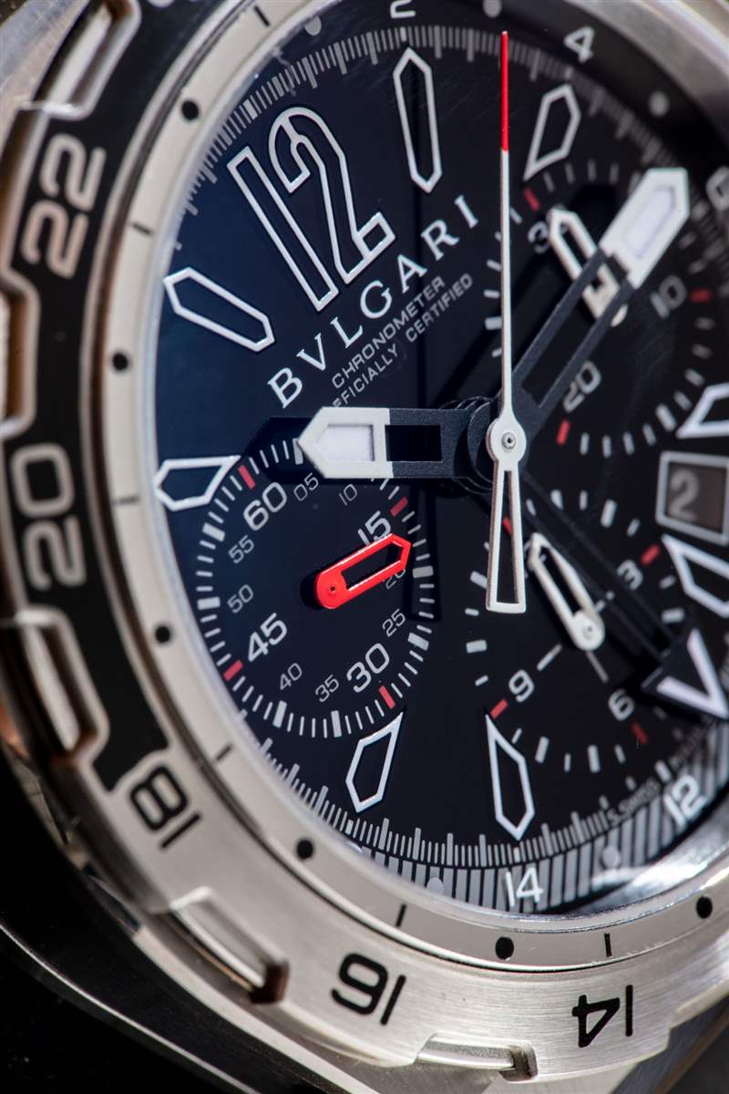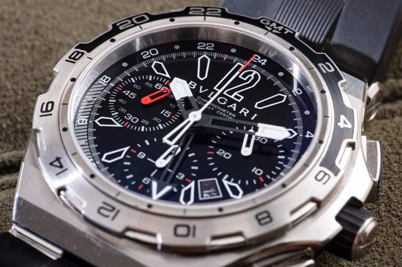 Diagono X-Pro 有一個旋轉表圈,需要一個小壓力機才能旋轉。雙向旋轉表圈采用印刷鋼制成,并帶有 GMT 指針標記。表盤上有另一個用于 GMT 指針的刻度,因此表圈可用于跟蹤第三時區。Diagono X-Pro 我最喜歡的部分是寶格麗決定使用一塊黑色藍寶石水晶作為實際表盤材料。從那以后我就再也沒有見過寶格麗這樣做了,這意味著要實現它可能是一個技術難題。然而,在我個人看來,其結果是有史以來最清晰、最清晰、最整潔的運動手表表盤之一。