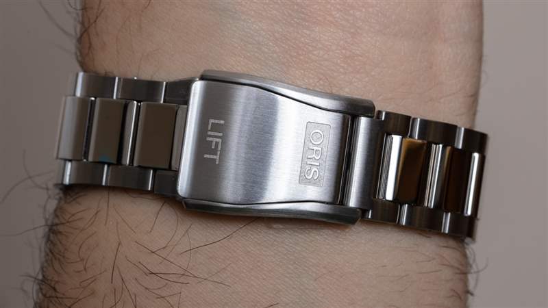 附在手表上的是一個三連桿錐形表鏈,與 ProPilot Big Date 的外觀相得益彰。我最喜歡的手鐲部分是展開式表扣。對于這款手表來說它并不是全新的,但對于 Oris 來說它是較新的,并且基于駕駛艙安全帶的打開系統(tǒng)。它不僅看起來很酷,而且操作起來很舒服。雖然我想象扣子可能會不時抓住東西,所以我想知道安全鎖是否有用。話雖如此,扣子從未在我身上打開過。否則手鐲相當(dāng)簡單直接。我覺得 Oris 可以設(shè)計一個微調(diào)系統(tǒng),或者至少提供一個半連桿。Oris Aquis 潛水表的表帶功能更強大,包括半鏈節(jié)、微調(diào)裝置和鏈節(jié)之間的螺絲桿。ProPilot Big Date 手鏈要簡單一些,