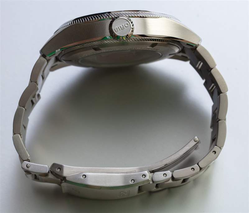 表盤發(fā)光體很好,雖然表盤沒有太多裝飾風(fēng)格,但它是一款出色的通用保守考究風(fēng)格和運動手表。灰色作為表盤顏色是一個明智的選擇,因為該顏色與大多數(shù)服裝非常匹配。我很欣賞 Oris 如何使用漂亮的圓頂藍(lán)寶石水晶,但在我看來,這款和許多其他 Oris 手表可以受益于更多的 AR 涂層。雖然考慮到表盤的清晰,易讀性并不是真正的問題,但減少眩光將進一步提升這款和其他 Oris 手表的外觀。