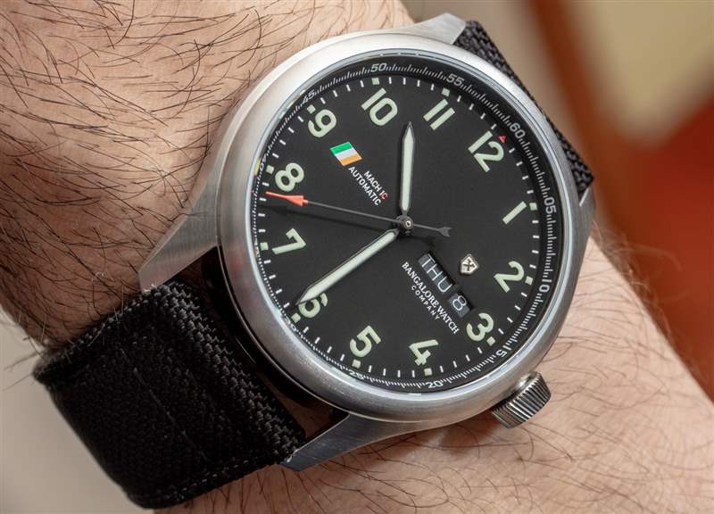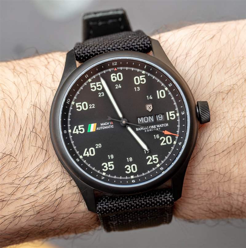 MACH 1 表殼寬 42 毫米(防水 100 米),厚 11 毫米,凸耳到凸耳的距離為 48 毫米。這一切都轉化為適合許多手腕的非常可穿戴且通用的尺寸。磨砂處理的表殼具有工業感,與要與空軍工具連接的事物的形象相關聯,幸運的是,表盤非常注重實用性。班加羅爾手表公司似乎真的想要制作一款看起來可以舒適地佩戴在駕駛艙內的工具型手表,而不是一款生活方式手表。原本啞光表盤上的平坦、AR 涂層藍寶石水晶鏡面無疑有助于保持非常好的易讀性。表盤上唯一的拋光元素是應用的班加羅爾鐘表公司小標志的一部分。廣告訊息廣告信息結束