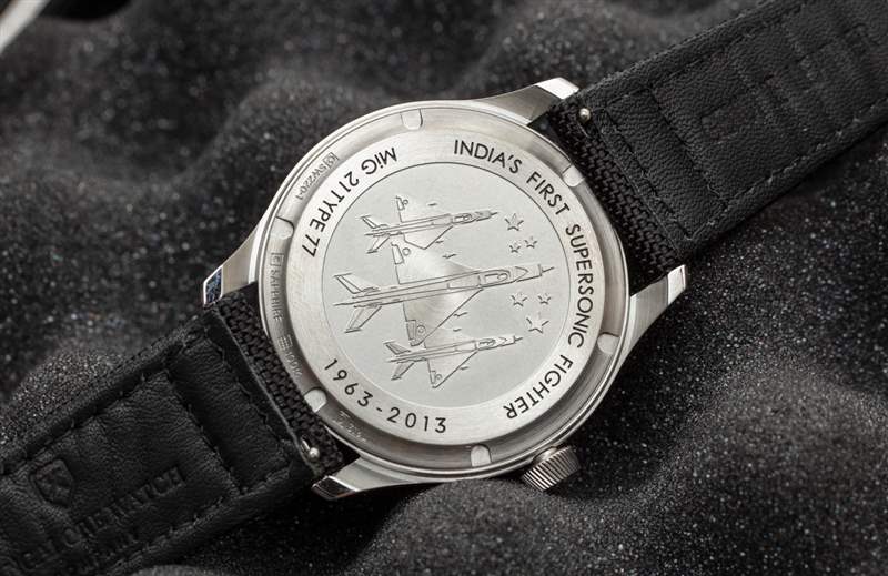 一個暗示米格 21 77 型噴氣式飛機本身的小細節是表冠,它略微呈錐形,看起來像噴氣發動機系統的一部分的加力燃燒器。這是對手表系列所基于的飛機的優雅而微妙的點頭。在手表的背面,我們看到三架 MiG 21 77 型噴氣式飛機的完整蝕刻,以及旨在解釋手表系列目的的慶祝文字。