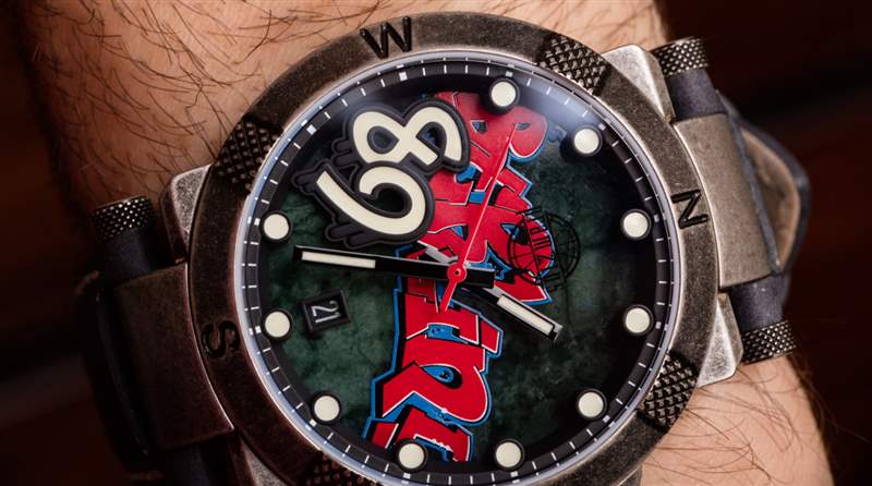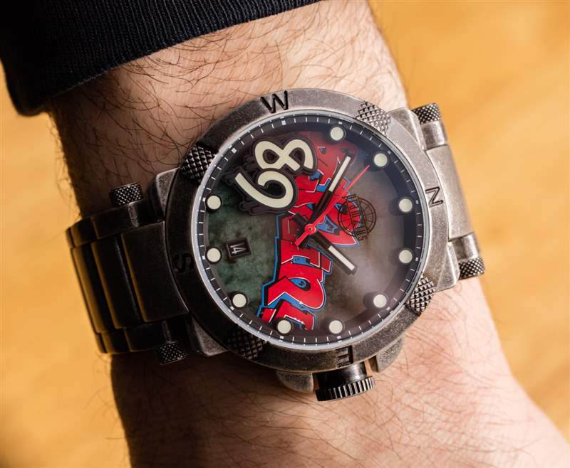 在我的手腕上是帶有“彩色表盤”的 42 毫米寬版本的柏林墻手表。特殊的“柏林”圖形靈感來自手表上的實際涂鴉(經 Pramzius 許可使用)。表盤本身是藍色的大理石石,表盤是清晰易讀的應用時標與涂鴉風格的 8 點鐘和 9 點鐘時標的混合體,它們被并置以創建“89”數字作為年份的標志1989年,柏林墻倒塌。考慮到表盤上的藝術,我實際上認為它整體上非常清晰易讀,指針和時標上的發光體使黑暗可見度令人印象深刻。