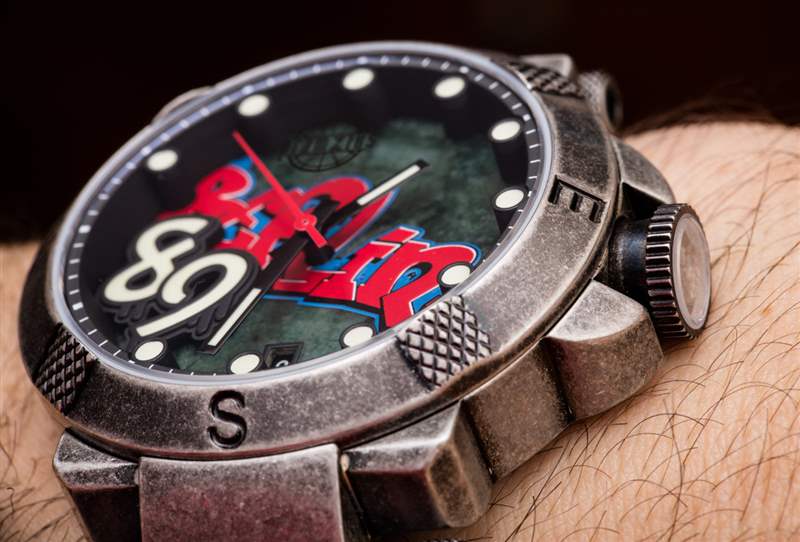 如果您去過柏林——尤其是柏林墻倒塌后的前二十年,您會立即體會到表殼和表鏈“陳舊、工業化”的外觀是如何與城市氛圍融為一體的。雖然有時表殼感覺有點像設計元素的大雜燴,但考慮到當前流行的“復古風格”(或者全新的)時計,它帶來了一種陽剛而舒適的美感。為了達到這種老化效果,100 米防水(表盤上方有藍寶石水晶)精鋼表殼和表鏈被賦予了視覺效果涂層。