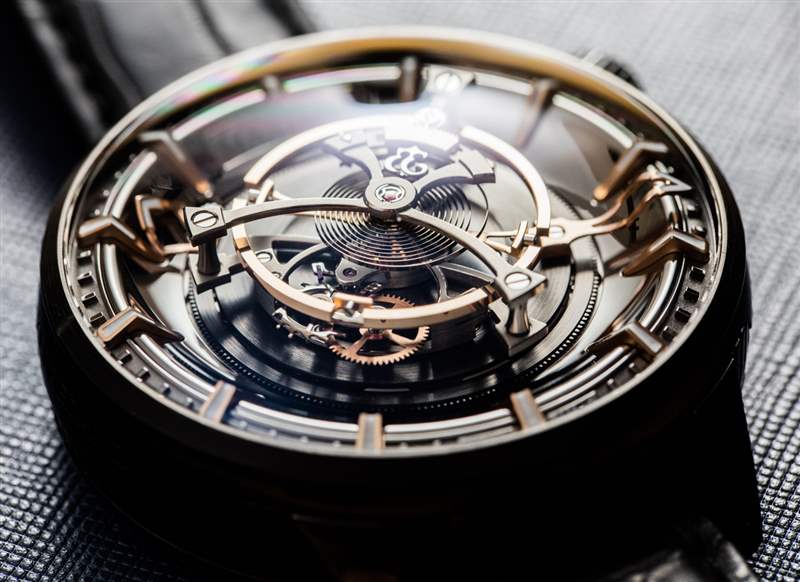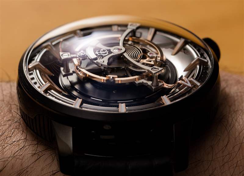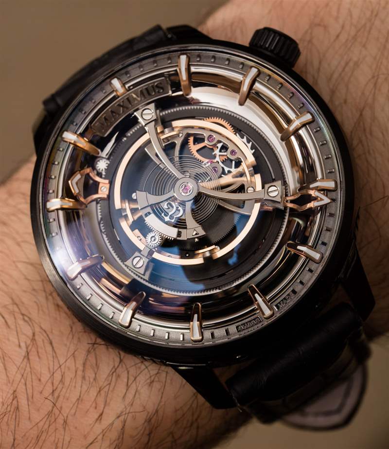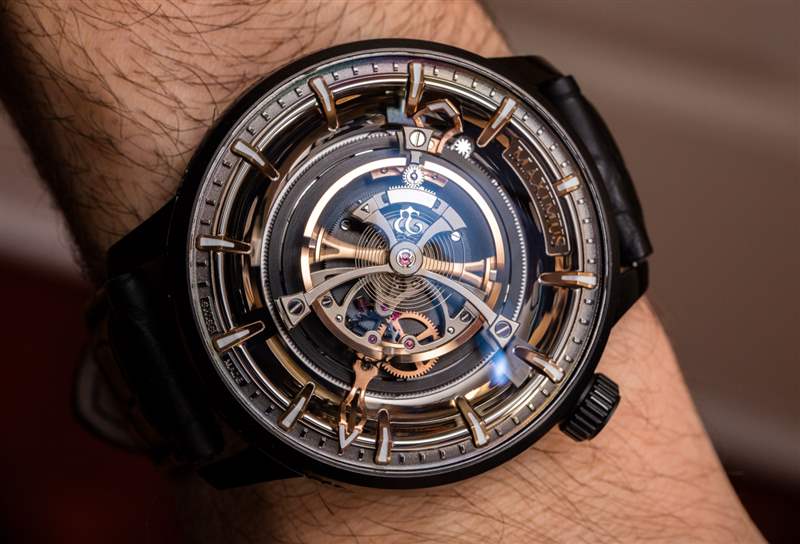 后一種說法不僅是 Maximus 49 毫米寬的表殼尺寸的功能,還因?yàn)闄C(jī)芯的小時(shí)鐘音量滴答聲來自為陀飛輪提供動(dòng)力的高扭矩機(jī)芯的正常運(yùn)行。表殼(此處為黑色涂層鈦金屬)也約 23 毫米厚,??頂部是大型 AR 涂層圓頂藍(lán)寶石水晶。盡管表殼的比例確實(shí)很大,但由于粗短的表耳和 54 毫米的表耳間距,Kerbedanz 使 Maximus 可穿戴。簡(jiǎn)而言之,雖然這絕不是一款小巧的時(shí)計(jì),但表殼設(shè)計(jì)確實(shí)允許大多數(shù)愿意佩戴的手腕輕松佩戴。
