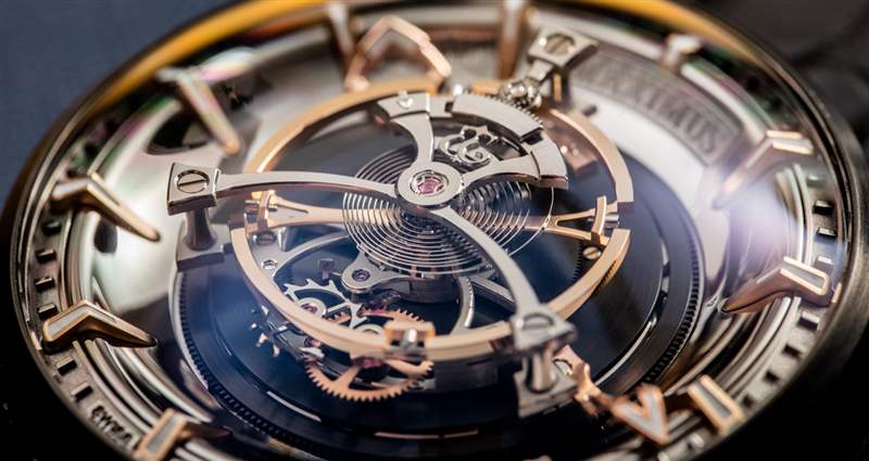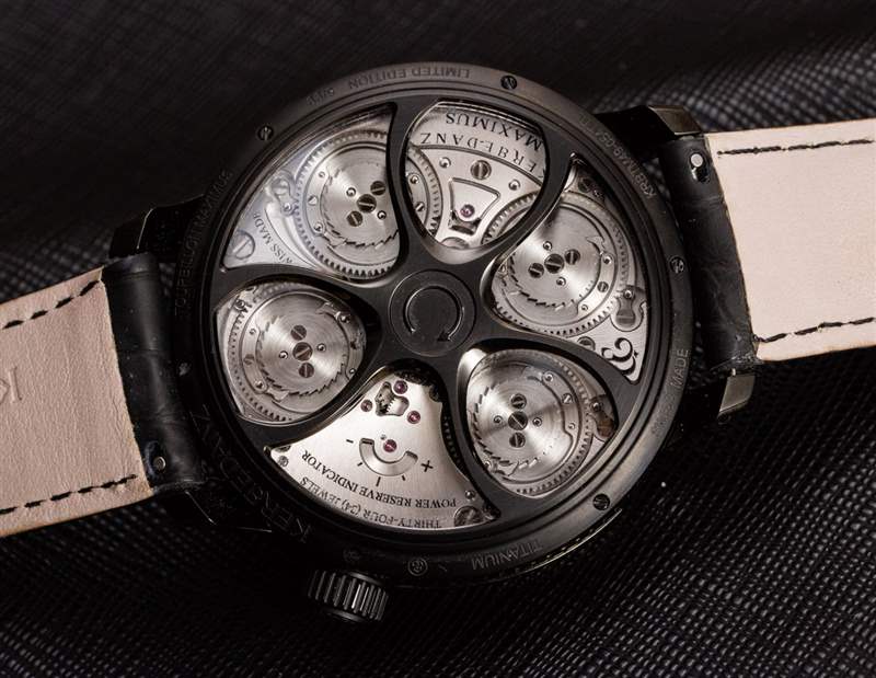 從技術(shù)上講,Maximus 手表的后部可能對(duì)我來說是最有趣的——我發(fā)現(xiàn)上弦機(jī)制是一種特別的樂趣,因?yàn)樵谵D(zhuǎn)動(dòng)時(shí)發(fā)條盒齒輪的觸覺反饋和愉快的咔噠聲。只聽發(fā)條盒齒輪的咔嗒聲就足以讓您想上弦。我將它與 Ulysse Nardin Freak 中的上鏈系統(tǒng)進(jìn)行了比較,這有點(diǎn)相似,因?yàn)槟惚仨毶舷也拍苌舷抑靼l(fā)條。大多數(shù) Ulysse Nardin Freak 手表的手指直接轉(zhuǎn)動(dòng)單個(gè)主發(fā)條盒,因此動(dòng)作或多或少是無聲的,沒有反饋。在 Maximus 中,您不是直接為一個(gè)發(fā)條盒上弦,而是控制一個(gè)同時(shí)為所有四個(gè)發(fā)條盒上弦的傳動(dòng)系統(tǒng),這就是您獲得良好反饋的原因。即使擁有如此強(qiáng)大的力量,