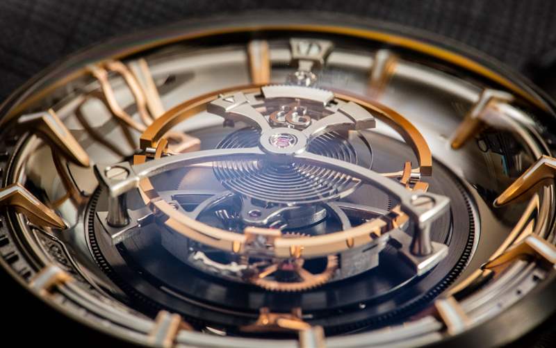 KRB-08 機(jī)芯的厚度使其能夠?yàn)槿绾螕碛兄醒胪语w輪和中央安裝指針提供一個(gè)有趣的解決方案。指針安裝在凸起的陀飛輪表殼下方并向上彎曲。用戶看不到大部分指針,而是看到指針的箭頭式提示,小時(shí)和分鐘是不同的。它們遵循高度彎曲的章環(huán),該環(huán)帶有應(yīng)用的時(shí)標(biāo)(此特定版本的 Maximus 為玫瑰金色)。請(qǐng)注意,Kerbedanz 聲稱其表盤和指針是內(nèi)部生產(chǎn)的,并且它們是用黃金制成的。我不會(huì)認(rèn)為 Maximus 是一款過于清晰的手表,但它的效果非常好。只需不使指針鏤空,就可以輕松實(shí)現(xiàn)更清晰的表盤。