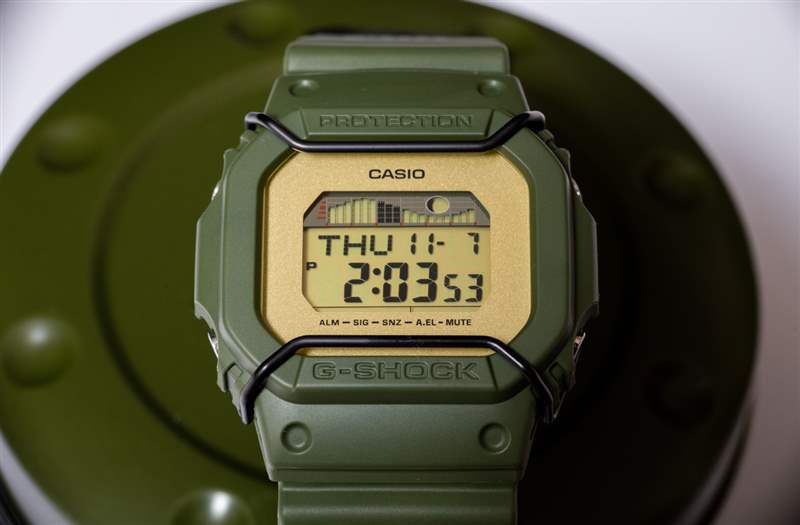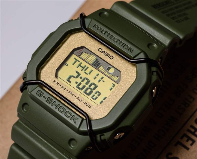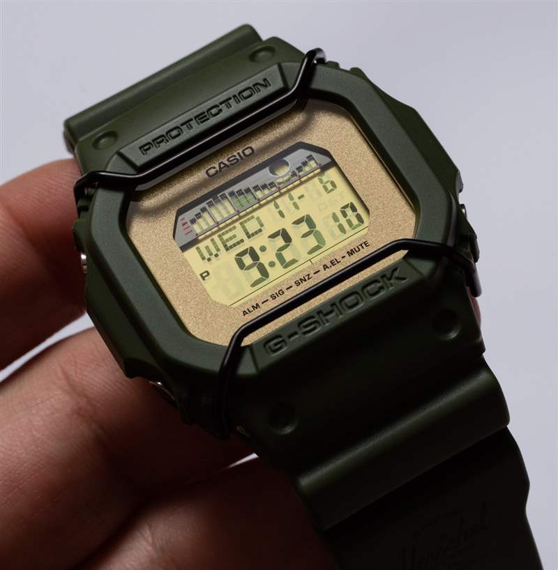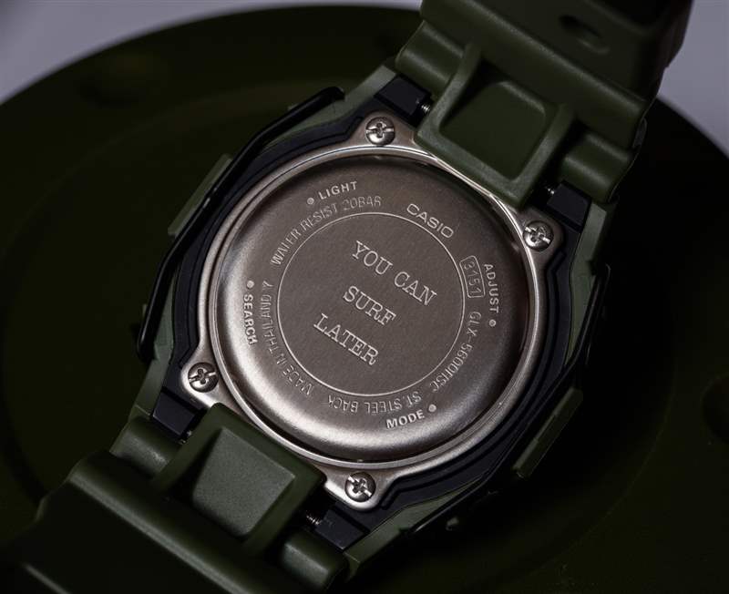 Jon Warren (JW):當(dāng)卡西歐找到我們時(shí),毫無疑問我們想要合作的手表。它必須是 G-Lide 潮汐表,因?yàn)樗蔷哂鞋F(xiàn)代氣息的經(jīng)典之作。在沖浪中,“First Watch”一詞用于描述第一個(gè)到海灘檢查波浪狀況的人。我們喜歡它也具有軍事意義,并將時(shí)計(jì)的設(shè)計(jì)與軍事功能和色彩以及潮表的性能聯(lián)系起來。我們從傳統(tǒng)的軍用手電筒中汲取靈感,打造了這款協(xié)作時(shí)計(jì)——從黃色鏡片、表帶上的軍用規(guī)格到手表背面的雕刻,應(yīng)有盡有。