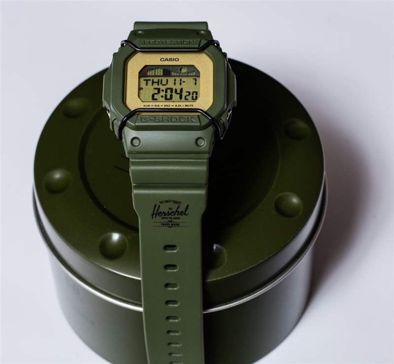 總而言之,它把自己想象成如果這些產(chǎn)品存在于美國退伍軍人從越南戰(zhàn)爭中歸來(并將他們的鐘表帶回來)的時(shí)候,G-Shock 會(huì)是什么樣子。手表的靈感實(shí)際上是一個(gè)士兵擁有的那個(gè)時(shí)代的 Zippo 打火機(jī),它的鋼制表殼上印有“You Can Surf Later”。同樣的聲明,同樣的字體,被印在這款手表的背面,并帶有一個(gè)適合時(shí)期的字體。讀起來會(huì)讓人發(fā)笑,也有助于解釋為什么 Herschel 決定使用 G-Shock G-Lide 手表,這款手表實(shí)際上是為沖浪者設(shè)計(jì)的,表盤上有月相和潮汐圖指示。不要錯(cuò)過在 1980 年代流行的外殼上逐漸“重新流行”的可拆卸金屬“屏幕保護(hù)膜”。