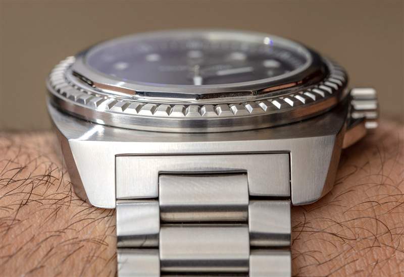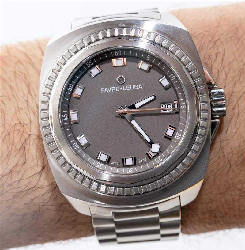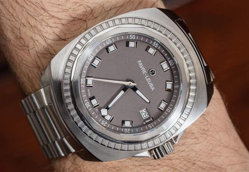 Favre-Leuba 設(shè)計(jì)的 Raider 表殼的靈感來自該品牌 1970 年代的歷史悠久的運(yùn)動(dòng)手表。正如我上面提到的,不銹鋼表殼是一種寬酒桶形,每一側(cè)都有一條有趣的線條,這有助于減少視覺質(zhì)量。您還可以獲得拉絲和拋光表面的組合,這在表圈組件周圍的外殼頂部特別好。這也恰好是我最喜歡的手表部分,因?yàn)楸M管它主要是裝飾性的,但它暗示了工具表的外觀和個(gè)性,而不僅僅是裝飾品。擋板實(shí)際上是兩個(gè)可以很好地協(xié)同工作的視覺部分。首先是水晶周圍的直接擋板,看起來有缺口,可以用扳手?jǐn)Q下來。接下來是外圈,看起來像是勞力士凹槽表圈的改良版。這兩種設(shè)計(jì)元素都暗示了可以旋入的組件——這是大多數(shù)防水潛水表的標(biāo)志。在我看來,這是一款非常巧妙且極具吸引力的設(shè)計(jì),適合一款外觀有趣且陽剛之??氣的時(shí)計(jì)。