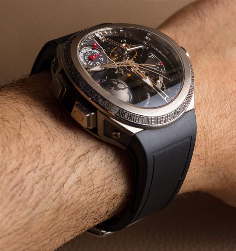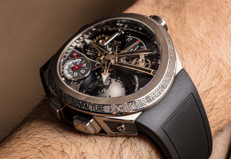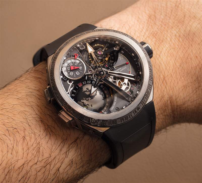 在手腕上,Greubel Forsey GMT Sport 非常舒適——這對于經常制造舒適手表的品牌來說并不令人意外(盡管他們的許多手表都具有高度原創的表殼形狀)。在定制的橡膠表帶上(其設計看起來好像與表殼融為一體),與其他高珀富斯手表不同,GMT Sport 具有手腕存在感。雖然它在手腕上很高,但我確實認為,對于合適的人來說,這款手表可以成為日常佩戴。