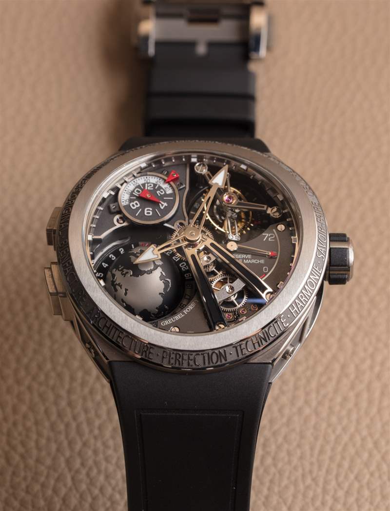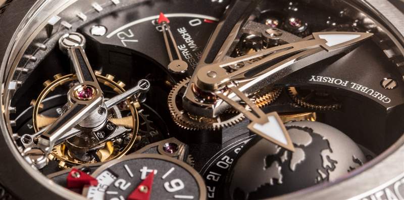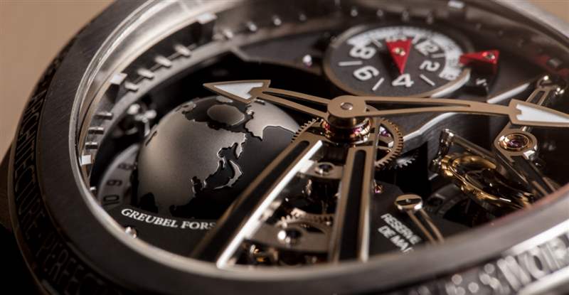 GMT Sport 內部是現有機芯的新版本:Greubel Forsey GMT 陀飛輪。該機芯包括一個以 25 度傾斜角安裝的陀飛輪(每 24 秒旋轉一次),以及時間、動力儲存指示器、日/夜 (AM/PM) 指示器和 GMT 指示器。后一種功能使用表盤上的半球形,優雅地翻轉一天,以及12小時指示器和表殼后部的移動圓盤。如您所見,GMT Sport 的首發版本將有一個“黑色地球”,而 GMT Sport 的后續首批型號將有一個更傳統的藍色地球。黑色地球模型將作為非常有限的套裝生產(如果我沒記錯的話,大概有 5 到 10 件)。廣告訊息廣告信息結束