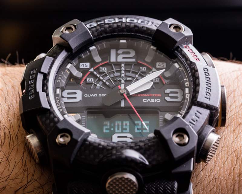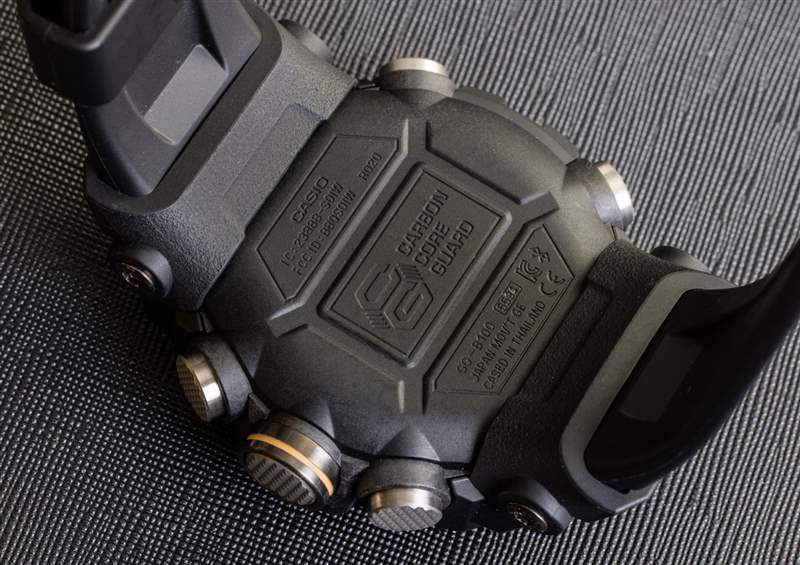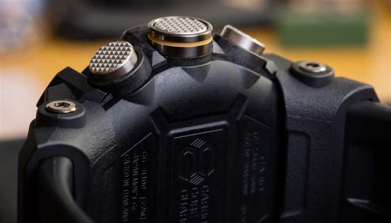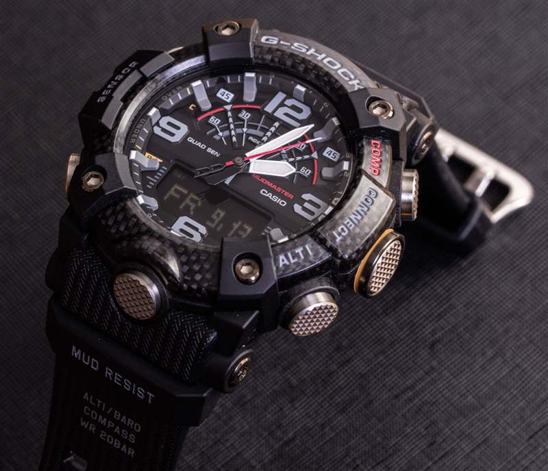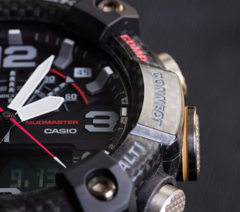 Mudmaster GG-B100 使用玻璃纖維和其他碳材料,重量驚人(55 毫米寬的手表為 92 克),而且結(jié)構(gòu)非常堅固。也太舒服了吧 卡西歐將這一新概念稱為其“Carbon Core Guard”表殼結(jié)構(gòu)。表盤上方是礦物水晶,表殼防水深度達(dá) 200 米。從美學(xué)上講,大多數(shù)情況下黑色碳纖維的外觀(多虧了擋板)非常華麗。卡西歐并沒有直截了當(dāng)?shù)貙⑵浞Q為碳纖維,而是將表圈稱為“嵌入玻璃纖維的精細(xì)樹脂結(jié)構(gòu)”。卡西歐對圖案和紋理越來越滿意,這有助于其產(chǎn)品看起來更好。傳統(tǒng)上,我認(rèn)為大多數(shù)人不會將 G-Shock 稱為“漂亮”,即使它們“很酷”。今天,情況正在改變,