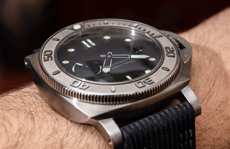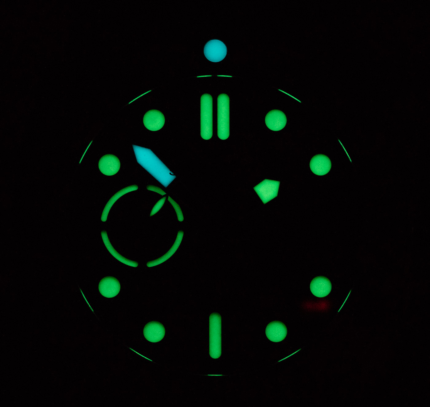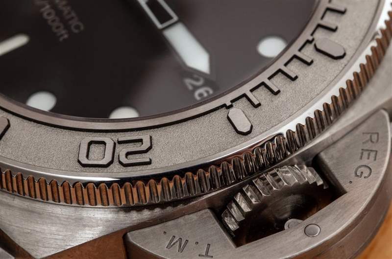 說(shuō)到藍(lán)寶石水晶,沛納海決定將表盤(pán)文字移到藍(lán)寶石水晶上。因此,沛納海采用金屬化技術(shù)將沛納海標(biāo)志和其他表盤(pán)文字應(yīng)用到藍(lán)寶石水晶的背面。結(jié)果是文字似乎漂浮在表盤(pán)上,并具有整潔的金屬外觀。公平地說(shuō),沛納海并不是這項(xiàng)技術(shù)的發(fā)明者,但他們使用得相當(dāng)好。有些人可能首先對(duì)水晶文字感到惱火,因?yàn)樗袝r(shí)看起來(lái)像指針上的表盤(pán)障礙物,但總的來(lái)說(shuō),我認(rèn)為它有助于為潛水式 Mike Horn 時(shí)計(jì)設(shè)計(jì)增添個(gè)性。