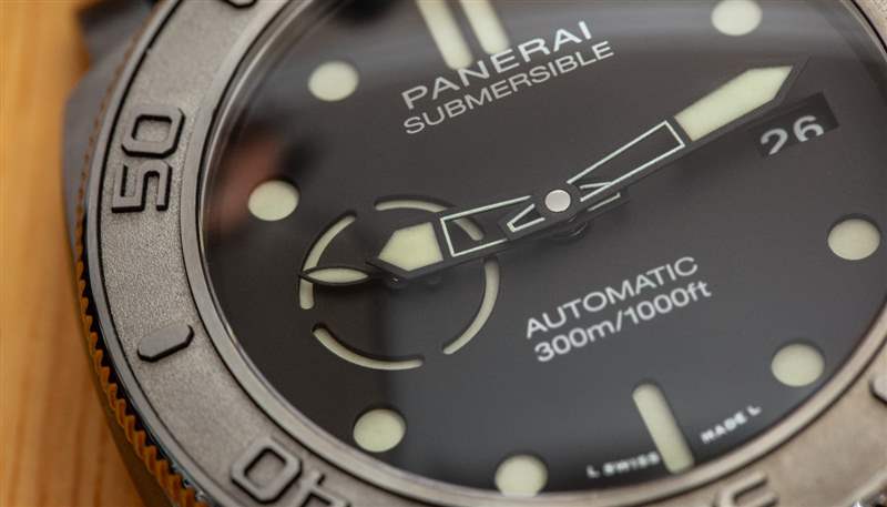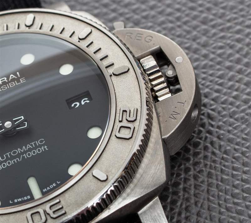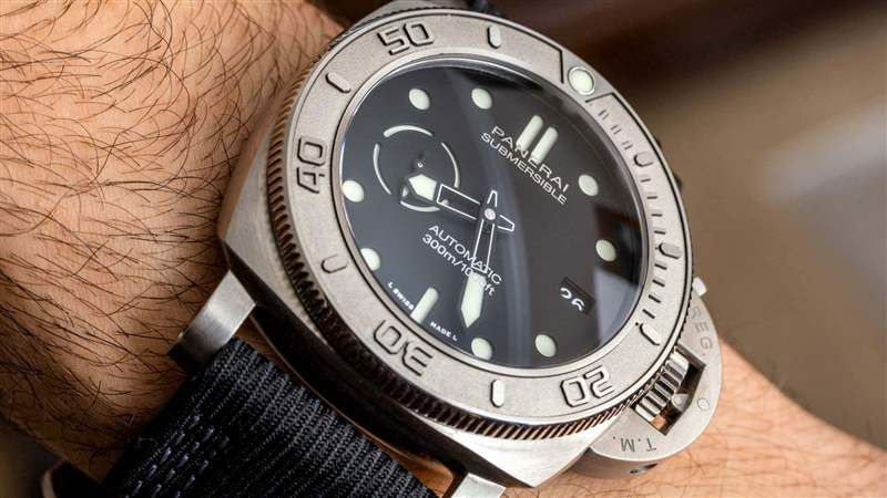 沛納海指出回收的生態(tài)鈦表殼是手表高成本的主要部分。據(jù)他們說(shuō),回收和重鑄鈦所需的工藝非常昂貴。這與許多其他“可持續(xù)”材料一致,因?yàn)樗鼈內(nèi)匀槐取霸肌辈牧细嘿F。無(wú)論如何,Eco-Titanium 仍然是鈦,它構(gòu)成了精細(xì)加工的 5 級(jí)鈦潛水表殼,這里有 47 毫米寬(不包括表冠),防水 300 米,因?yàn)檫@是潛水員風(fēng)格的潛水系列手表. 沛納海 (Panerai) 是為數(shù)不多的手表在手腕上仍然看起來(lái)不錯(cuò)的少數(shù)品牌之一,鑒于其鈦表殼材料,Submersible PAM984 的所有尺寸都可預(yù)見(jiàn)的舒適且重量輕。表殼厚約 15 毫米,凸耳到凸耳的距離約為 56 毫米。表盤(pán)上方是一個(gè)鍍有 AR 涂層的圓頂藍(lán)寶石水晶,實(shí)際上它的圓頂比我戴過(guò)的其他沛納海手表要少一些。較少的圓頂有助于減少眩光,從而提高表盤(pán)的易讀性。