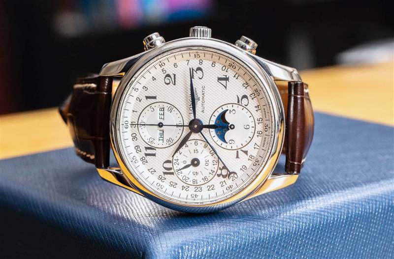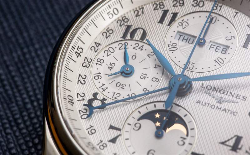 核心 7751 機芯旨在為標志性的 Valjoux 7750 自動 12 小時計時碼表增加功能。它添加的是一個完整的日歷(顯示月份、日期和星期幾),以及一個月相指示器和同步 24 小時指針,有效地用作 AM/PM 指示器。十多年來,我一直在撰寫有關(guān)使用 7751 機芯的手表的文章,我將提醒讀者,7751 的缺點之一是它為尋求創(chuàng)造視覺平衡表盤的制表師帶來了特殊的設(shè)計挑戰(zhàn)。表盤上信息的大部分“重量”都在左側(cè)。這意味著表盤的右側(cè)相對稀疏,通常保留用于手表品牌標志。浪琴表設(shè)計這款 Master Collection 表盤的設(shè)計與 7751 奇特的表盤布局大致相同。