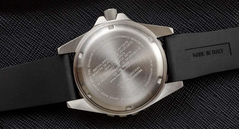 盡管 Marathon 是一家加拿大公司,但該品牌的手表是在瑞士拉紹德封組裝的,并配備了瑞士制造的機芯。Jumbo Diver’s Automatic 內部是瑞士 ETA 2836-2 自動星期/日期機芯,以 4Hz 運行,動力儲存約兩天。Marathon 在舒適的 22 毫米寬黑色橡膠表帶和三鏈節鋼表鏈上提供 JDD。后者不會像運動型或實用型,但它確實有助于讓手表看起來更考究。盡管我通常是一個手鐲人,但我更喜歡帶子上的 JDD。