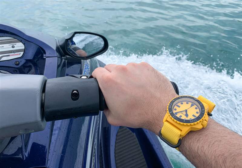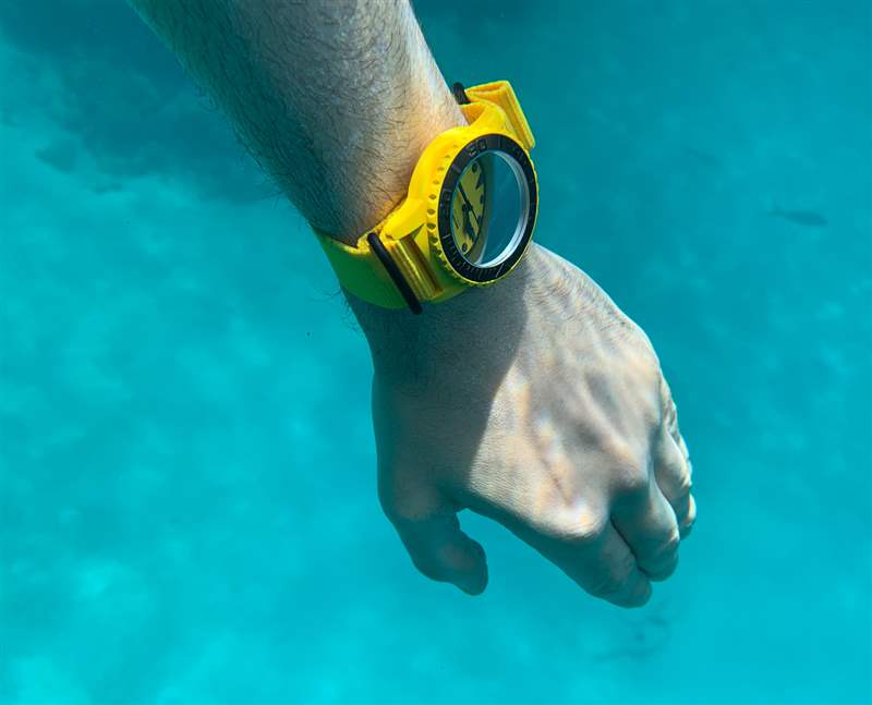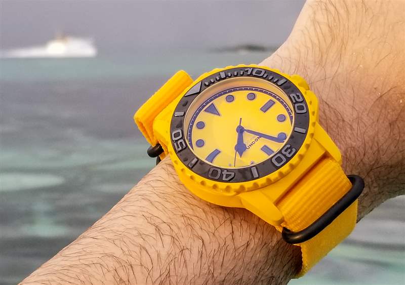 佩戴 Aqua BLK + YLW 是一種有趣的體驗,因為您開始注意到周圍的黑色和黃色的一切。黑色和黃色代表巴哈馬國旗顏色的三分之二(在拿騷周圍的藍綠色海水中,它成為國旗)。無數黑色和黃色的魚在水中游動,你會發現很多潛水設備也是黑色和黃色的。島嶼周圍也有數量驚人的服裝和比基尼組合,具有相同的配色理念。我敢打賭,在世界不同地區,這款和未來的 BLK + YLW 手表將呈現出各種身份。