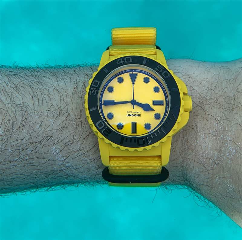 在他們真正考慮弄濕手表之前,沒有人會考慮手表的耐用性。每次第一次將新鮮手表放入水中時,都會有片刻的擔心。我以前有過手表起霧——但從來沒有泛濫過——所以這種擔心并非沒有道理。潛水表不僅僅是防水;它們還必須非常易于閱讀、耐用,并且——最重要的是——舒適。在定制的黑色和黃色 NATO 風格表帶上,Undone Aqua 佩戴在手腕上非常舒適,這款 43.5 毫米寬的時計也恰好有一個重量驚人的表殼。廣告訊息廣告信息結束