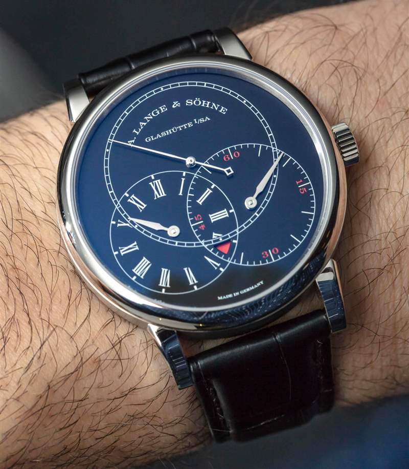 18k 白金表殼本身寬 39.9 毫米,厚 10.6 毫米。表盤上的紅色小提示是運(yùn)動(dòng)的,并提醒佩戴者,這款手表的核心是提醒用戶使用古董科學(xué)觀察設(shè)備。今天,對(duì)于想要有足夠機(jī)會(huì)講述有關(guān)腕表故事的人來說,這或多或少是一款燕尾服或正裝腕表。朗格在這個(gè)模型上錯(cuò)過了一些其他手表的完美易讀性。帶有薄拋光指針的黑色表盤通常難以在直射光下讀取。A. Lange & Sohne 處理這種材料和飾面的組合與預(yù)期的一樣好,但我希望指針是白色的,以提高易讀性并與時(shí)標(biāo)和索引的顏色相匹配。