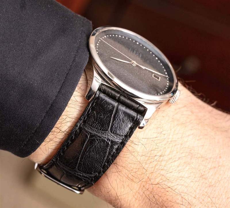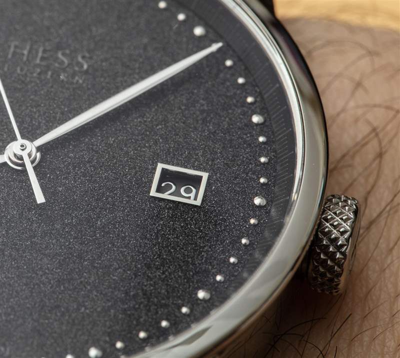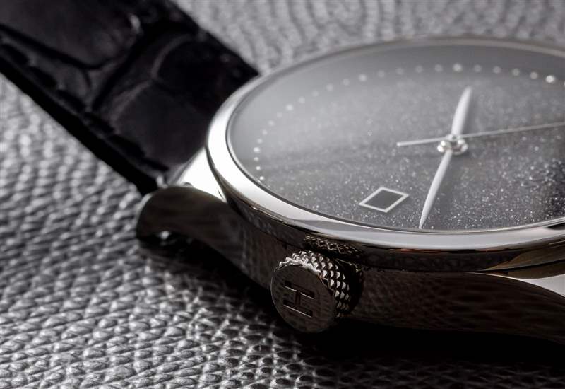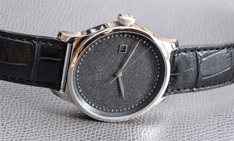 說到拋光和表面如何與光一起玩的問題,讓我們談談我最喜歡的 TWO.2 Diamond Dust 手表的部分,即表盤本身。鉆石粉塵表盤是使用特殊工藝生產(chǎn)的,其中實際的小鉆石顆粒通過某種粘合工藝附著在表盤上。然后,表盤具有閃亮的紋理,這絕不是壓倒性的,而是起到微妙的背景光澤。鉆石塵表盤是一種男性化的方式,可以在手腕上展現(xiàn)俏皮但正式的鐘表美感。鉆石塵表盤有一種獨特的慶祝元素,它不像手表上嚴格佩戴鉆石那么顯眼,而且比標準的黑色表盤更友好或更有趣。Hess 將其標志放在表盤上,具有諷刺意味的是,在鉆石灰塵的表面上很難看到它,