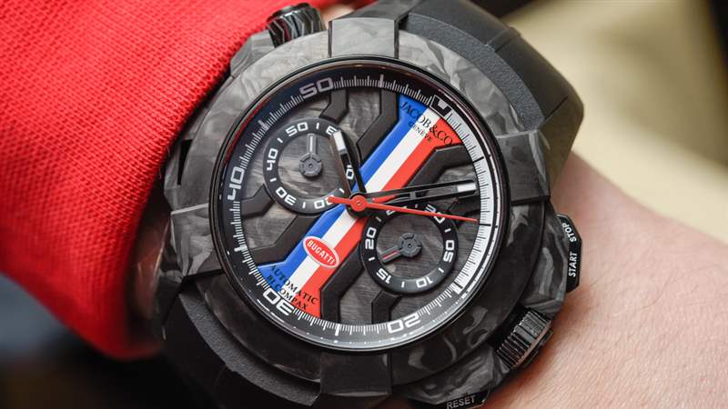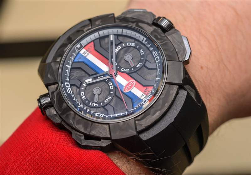 Epic X Chrono 是 Jacob & Co. 的一個有趣系列,與入門級 Jacob & Co. 手表的價格相近。對于這個特別的布加迪版本,Jacob & Co. 創造了一個外觀整潔的黑色鍛造碳(非常輕)和深色 DLC 涂層鈦金屬表殼。“X 風格”表盤的中間是紅色、白色和藍色,就這款手表而言,它們是布加迪的顏色。布加迪標志通常只有紅色和白色,但在某些情況下,紅色和白色(黑色)標志位于藍色背景。否則,您可以簡單地將這個表盤視為法國國旗的鐘表表現形式。